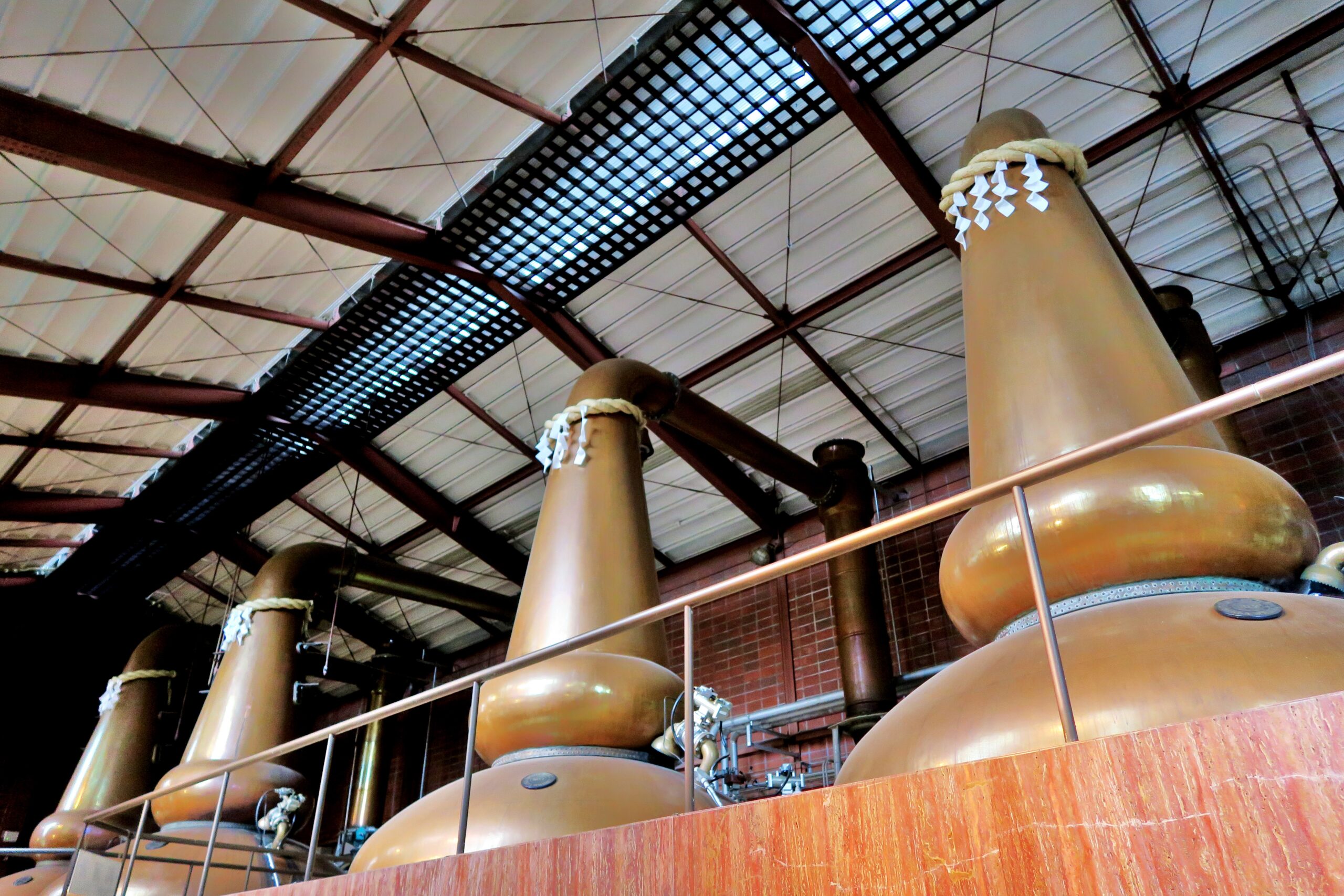 ここで見学受付を終えれば、ガイドツアーが始まり仕込棟から蒸留棟へと施設を見学していきます。宮城峡の華やかで軽やかなモルト原酒は、約130℃のスチームでじっくり蒸留し、何度も還流を繰り返す「蒸気間接蒸留」から生まれます。そのためポットスチルも余市の細身のものとは違いふっくらとした形をしています。また世界でも希少なカフェ式連続式蒸留機を使っています。酒造りの神への敬意を表すためしめ飾りがされています。