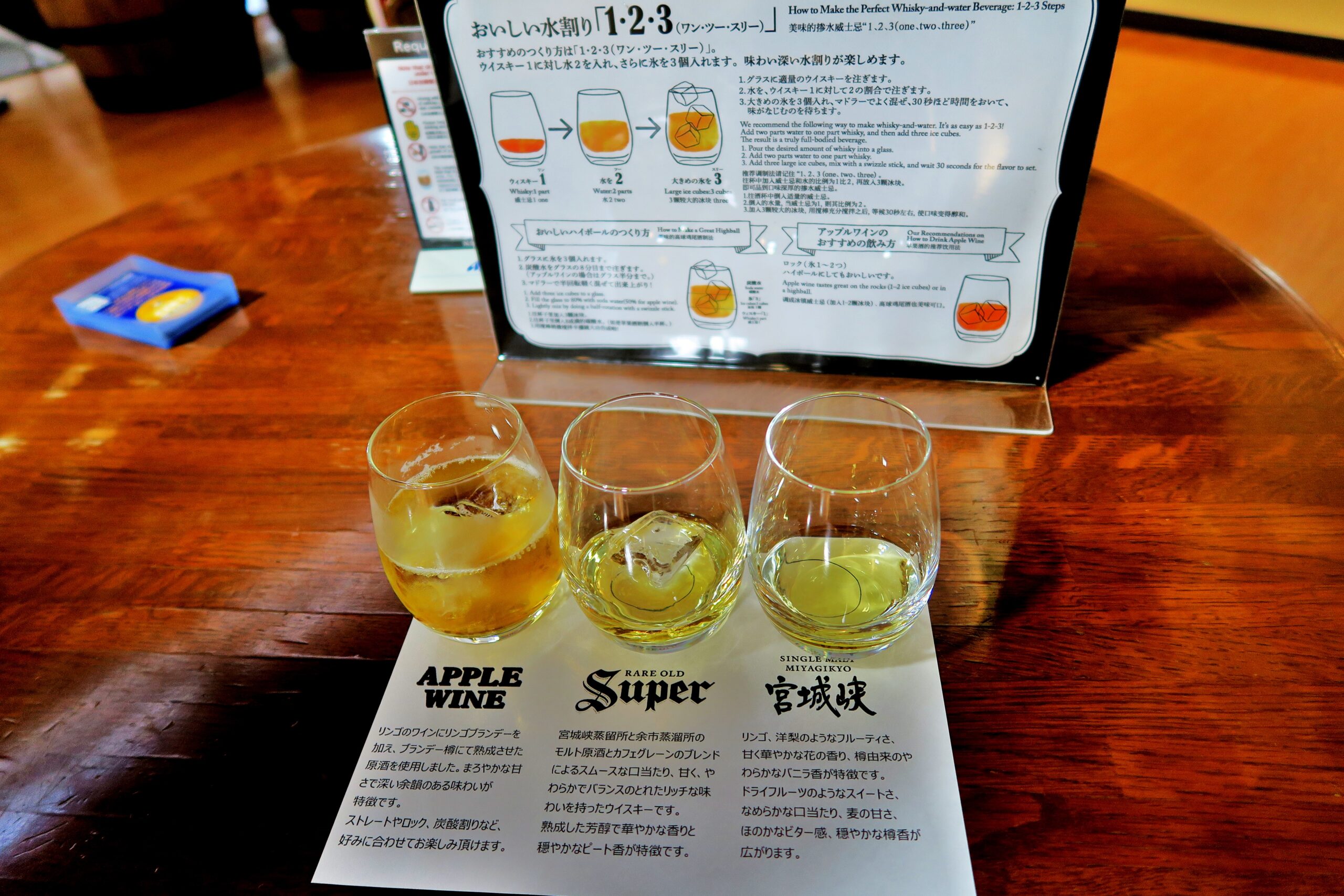 今回はいつものスーパーニッカにシングルモルト宮城峡が味わえた。深い森で静かに熟成されたモルトウイスキーは、リンゴ、洋梨のようなフルーティさ、甘く華やかな花の香り、樽由来のやわらかなバニラ香が特徴です。それにアップルワインという炭酸割りに適したブランデータイプの計3種類がいただけた。