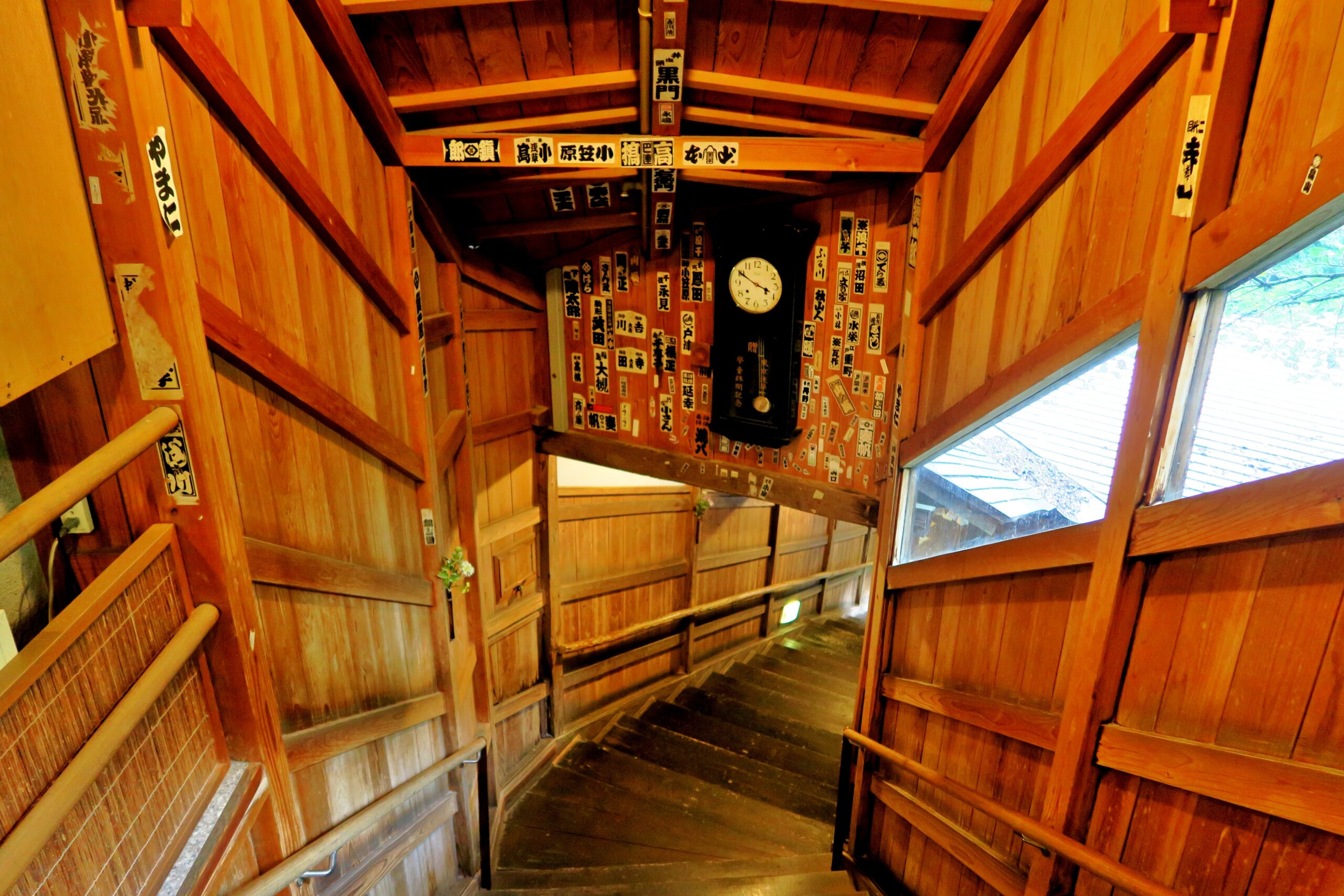 レトロな雰囲気が漂う木造建築の宿は、旧館の広瀬館と新館の青葉館に分かれていて、全91室です。そんな宿の中で今もほとんど変わらない形でそこに残るレトロな階段は、開湯当時と変わらず時が止まったかのような趣で地下1階からさらに88段の階段を下りた広瀬川の渓流沿いに湧き出る「鷹の湯」へと続いています。