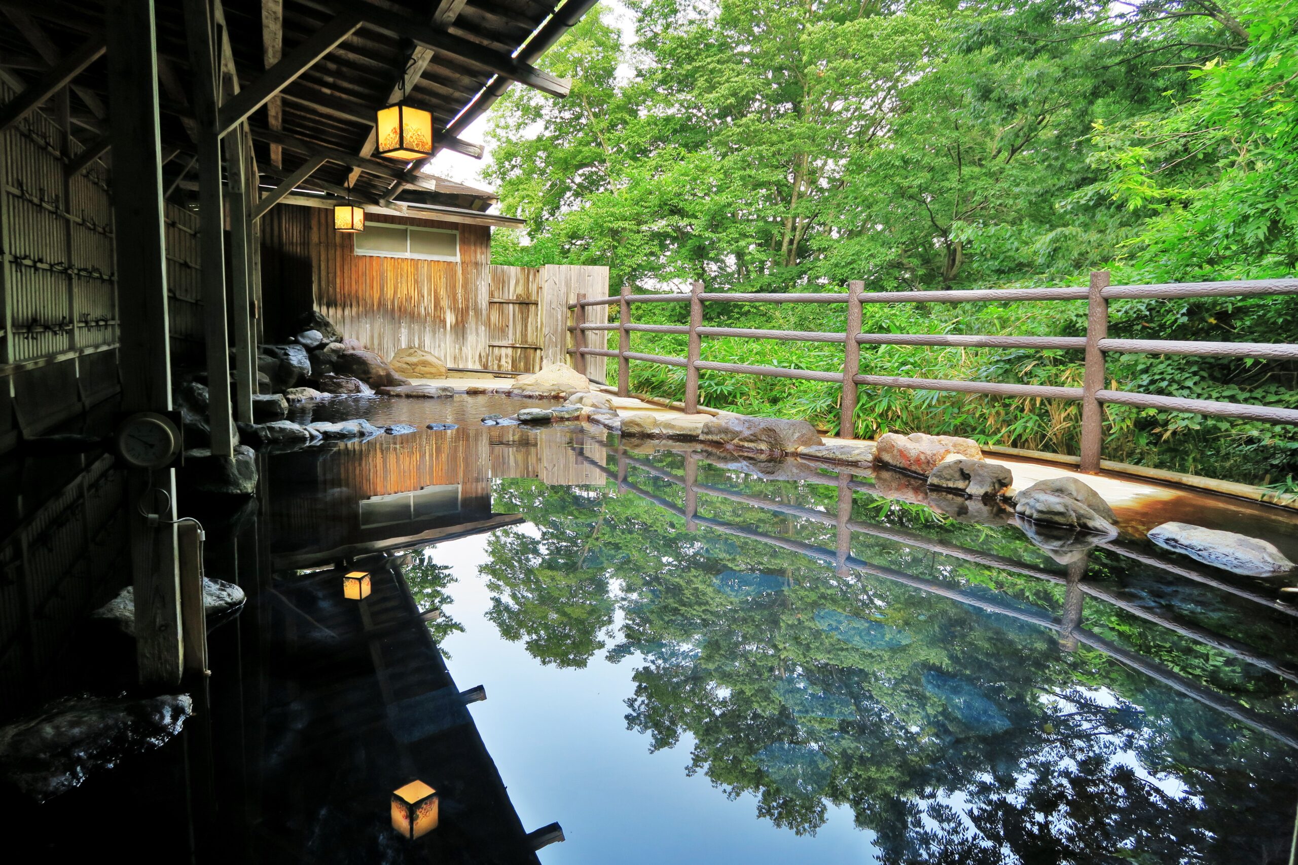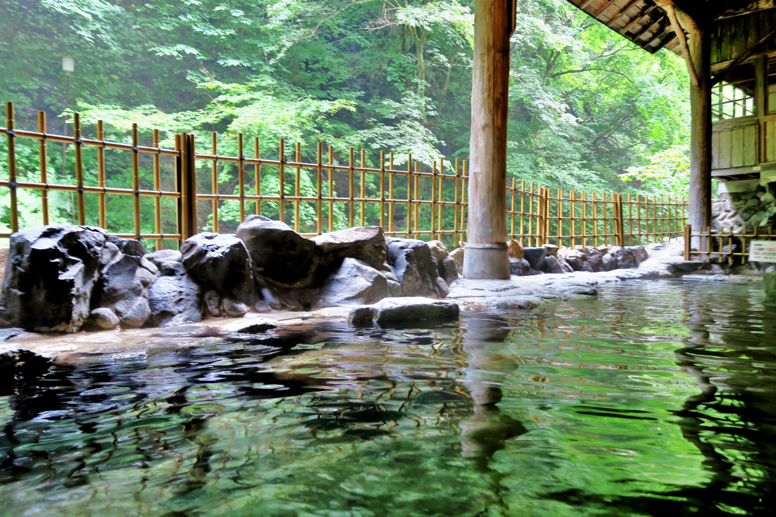 一番のお気に入りは東館1Fの山沿い露天「水芭蕉」の湯です。緑の静寂の中、自然と一体となって湯に浸かると身も心もリフレッシュできます。泉質はナトリウム・カルシウム-塩化物泉でしとりと肌にまとわりついてきます