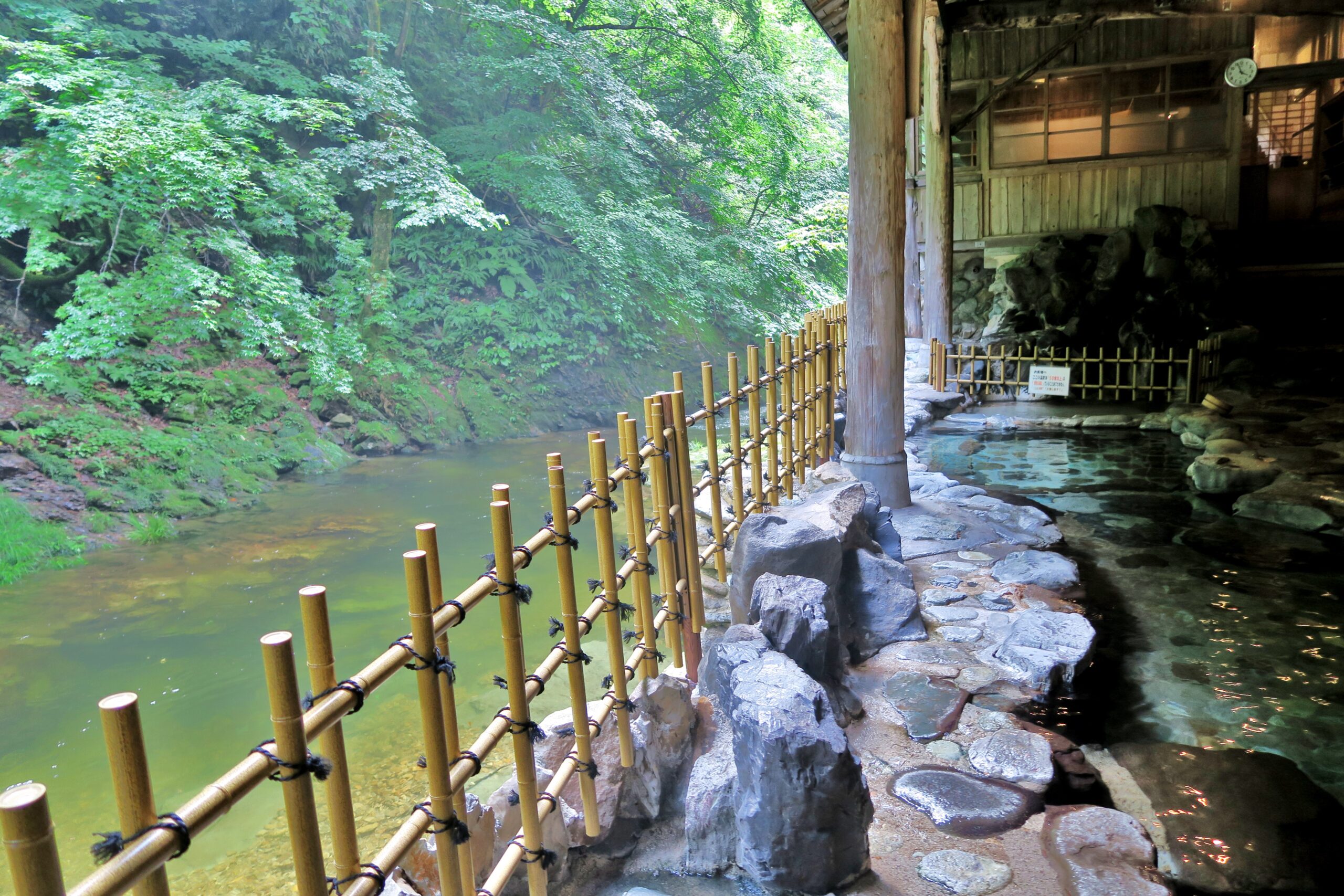 目の前に四季折々の渓谷美が広がり、この時期夏の涼風が運ぶ緑の香りが清々しく、目の前の渓谷美を眺めながらゆったりと過ごすことができます。天然岩風呂は混浴ですが、女性専用の時間も設けられていて安心です。