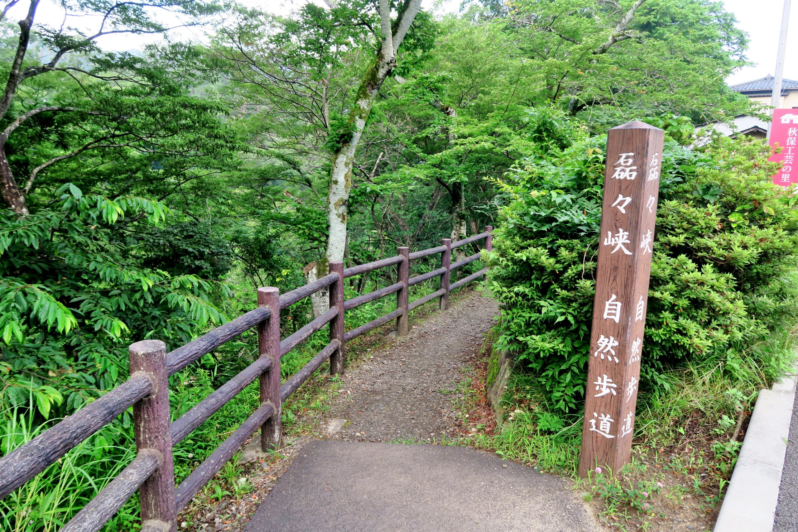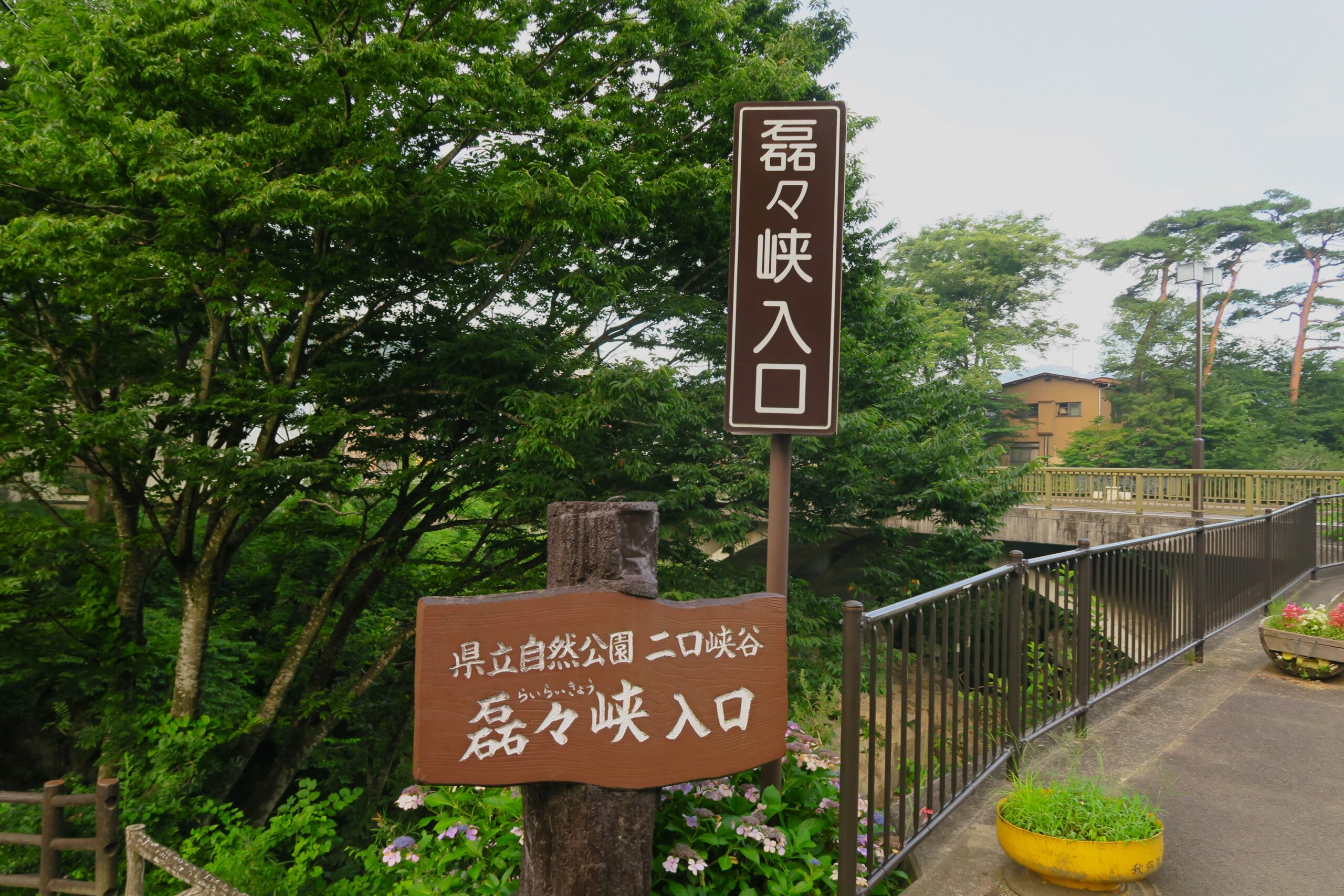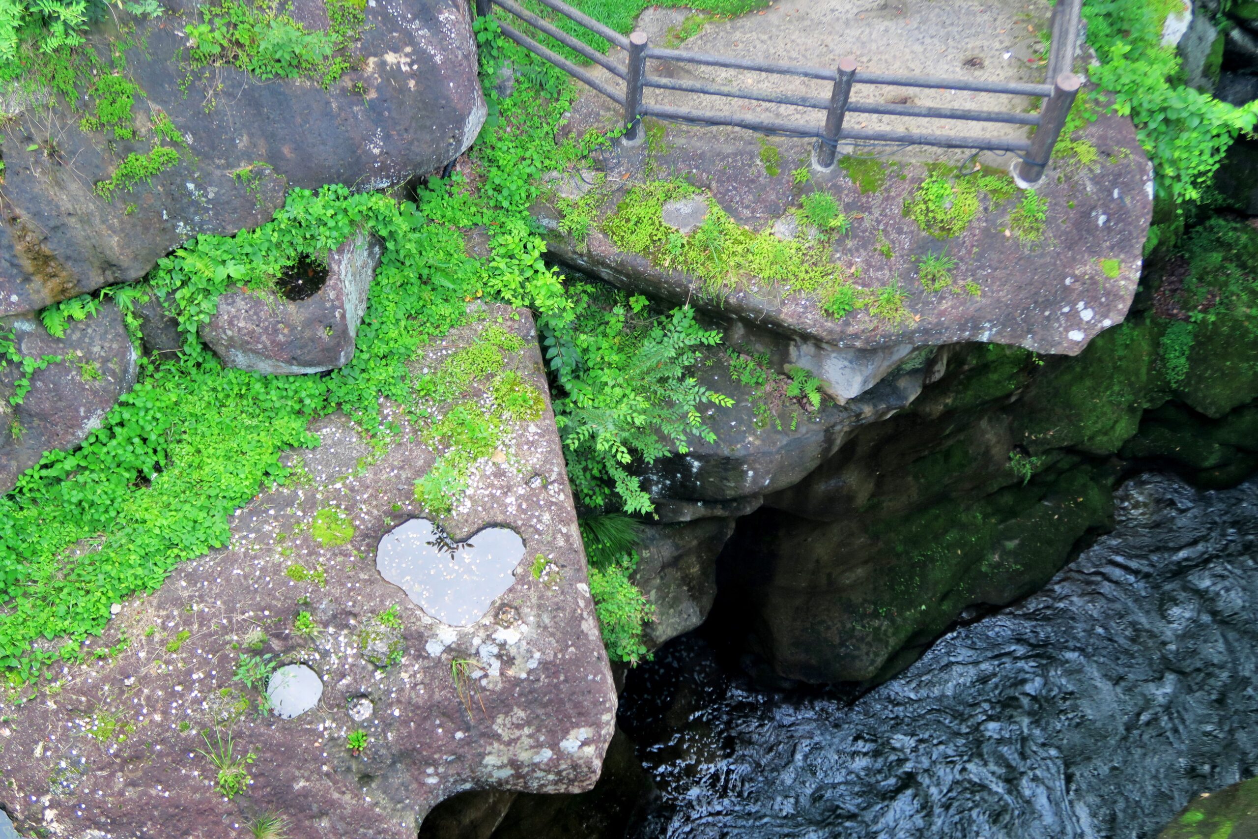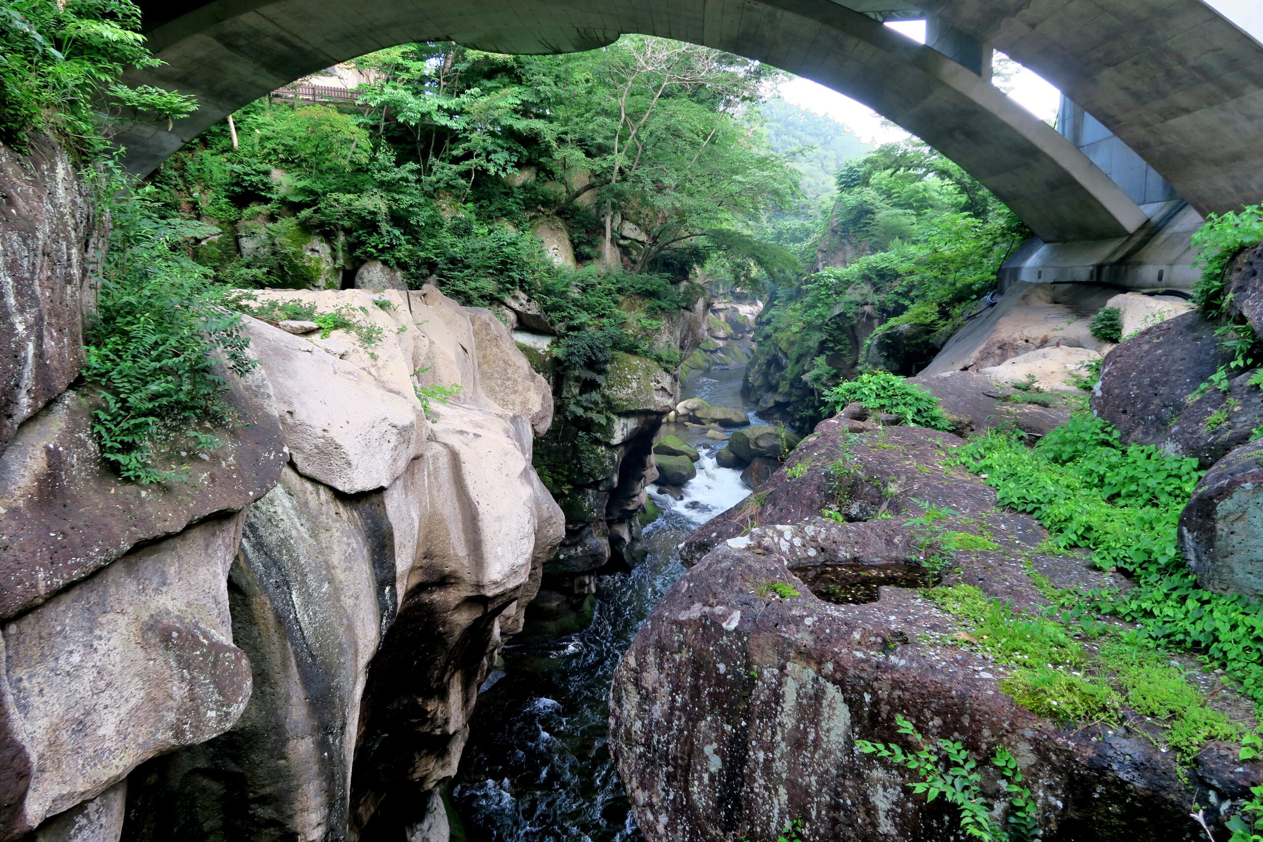 温泉街のほうに歩くとすぐに「磊々峡」入口があります。ここから覗橋までは渓谷沿いに約800m遊歩道が続き、壮大な巖の連続、急流に現れる奇岩怪石を間近に眺めることができます。