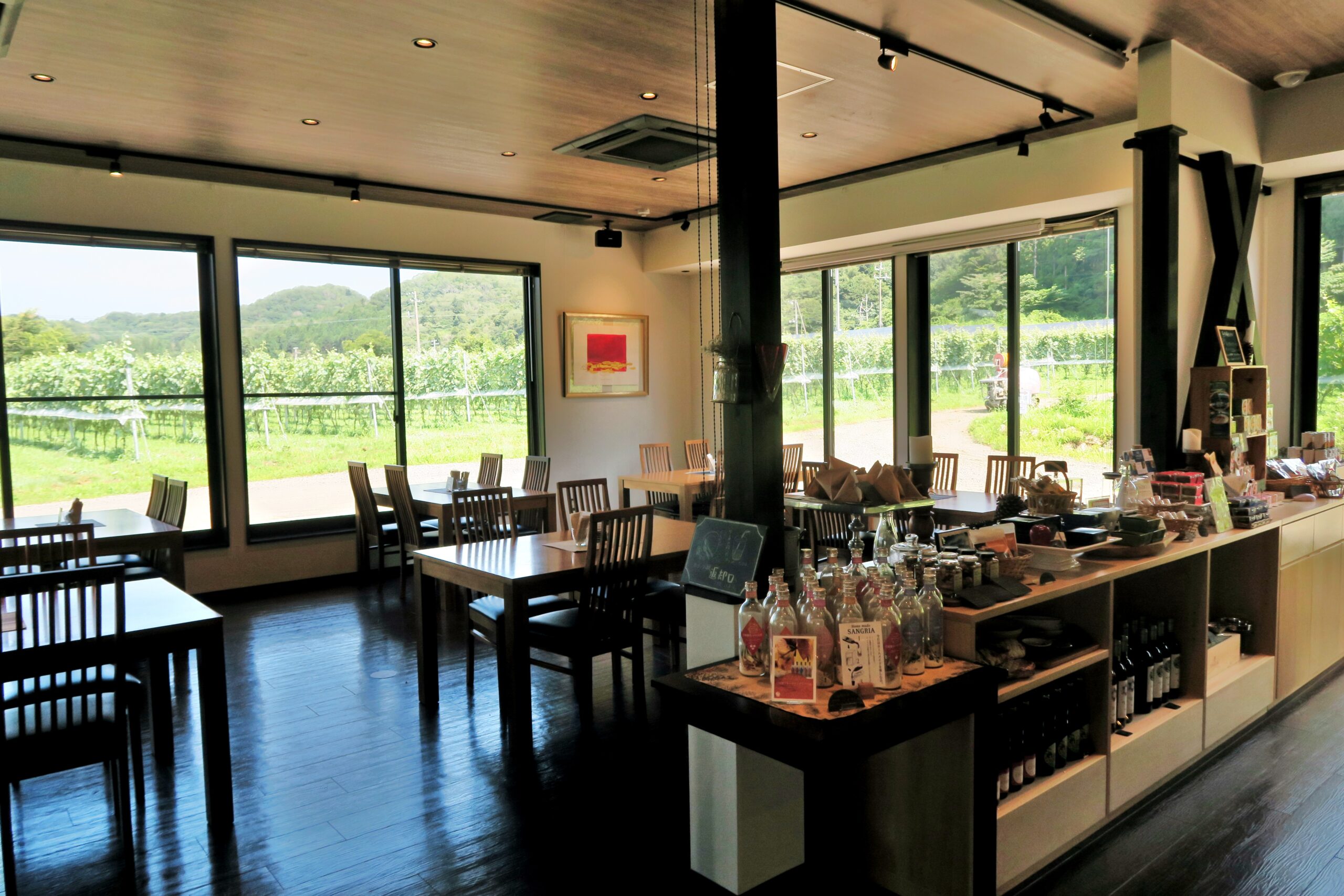 秋保温泉郷に位置し、建築家だったオーナーの毛利さんが設計したモダンな外観が目をひきます。敷地内には自社農園や醸造所、熟成庫、試飲スペース、カフェなども備え、人気のスポットです。ブドウ畑に囲まれたガラス張りのレストランとショップでは、ワインと地元産の食材が楽しめます。レストランの奥にある醸造所の見学はできませんが、運がよければステンレスの置かれた扉の奥の様子が伺えます。