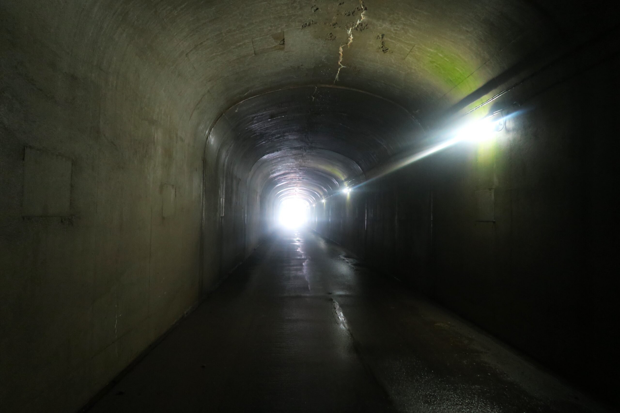 今回は左手のトンネルから湯俣温泉への道で一軒宿の晴嵐荘まで約10㎞、3時間の道程です。スタートして、約5kmの東京電力の工事林道を歩きます。まずはいきなり高瀬隧道と呼ばれる約1kmを超える長い第一トンネルが振り出しで、その後第二トンネル、第三トンネルと大小あわせて3ヵ所続きます。ルート前半は発電施設のための車道なので関係車両が通ったりしますが、それでも気分は爽快です。