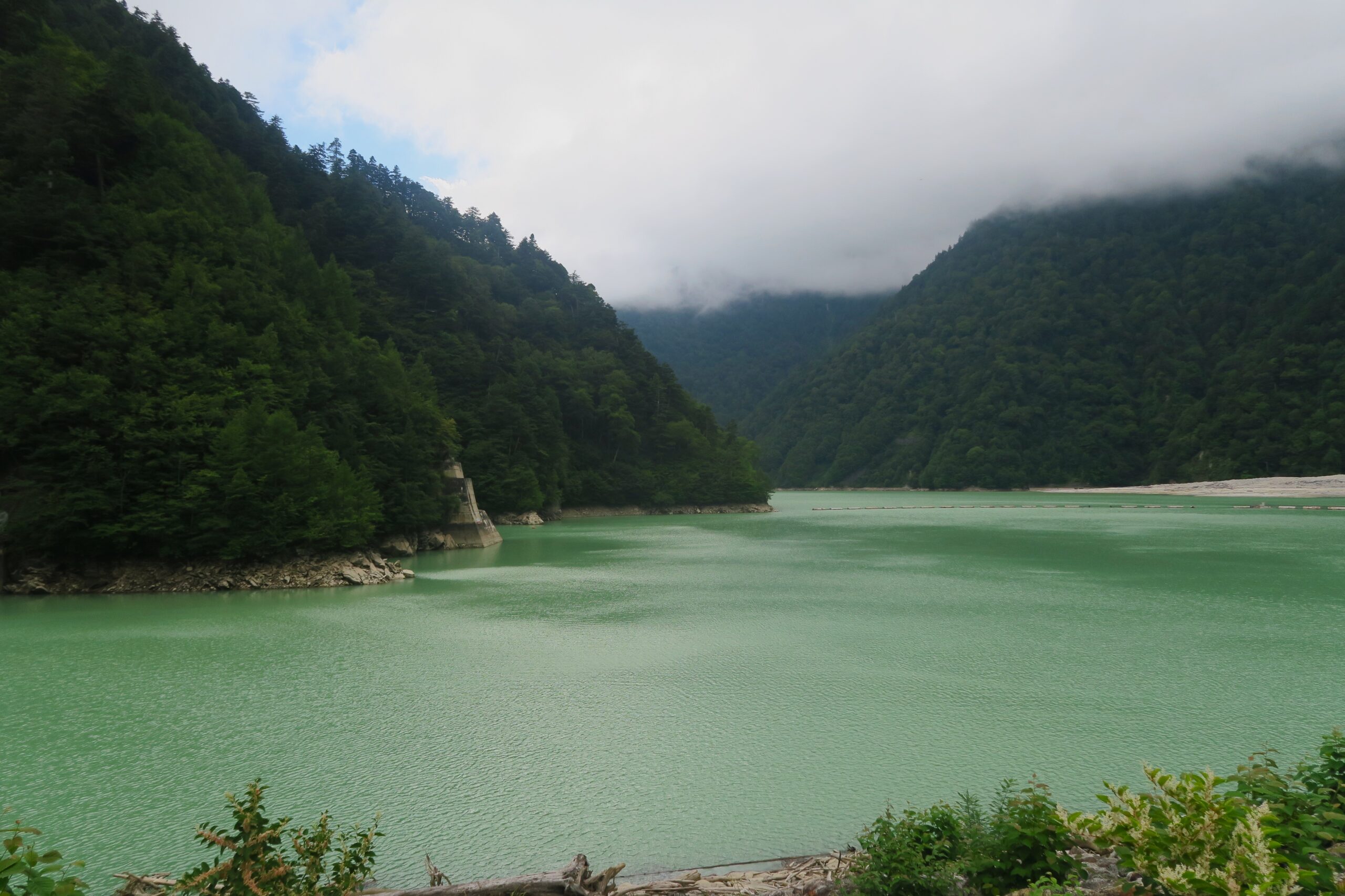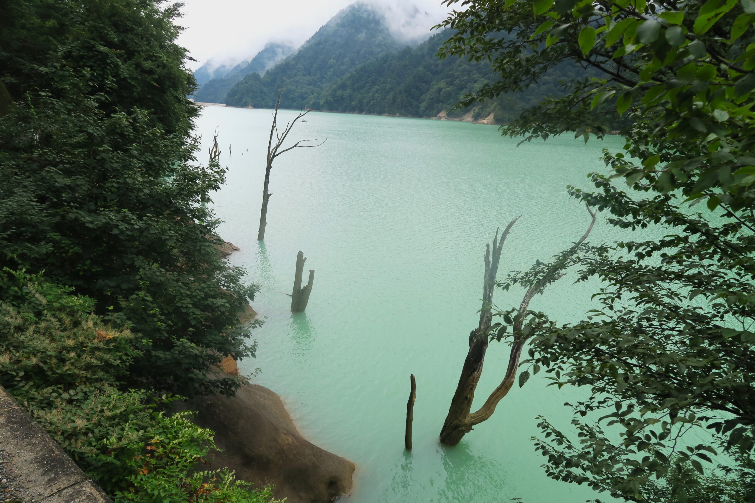 二つ続いたトンネルを抜けるとようやく眺めのいい場所に辿り着きます。右手に広がるダム湖の水面がエメラルドグリーンに輝いています。時折風に乗って鼻をくすぐる硫黄臭からも温泉成分が流れ込んでこの神秘的な光景を創り上げているのだろうと感じます。