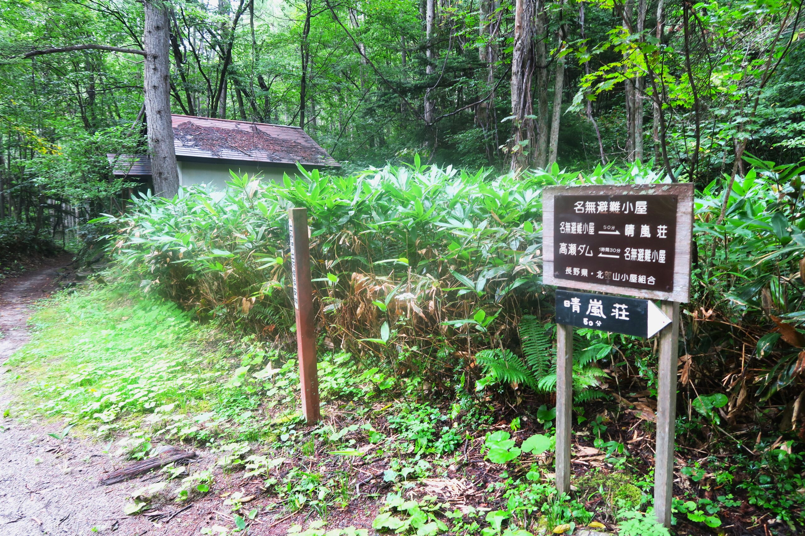 途中の道標の案内は晴嵐荘のみですが、本当は前方彼方に槍ヶ岳北鎌尾根山塊が見えるように、そこに通じる険しい登山道でもあり「名無避難小屋」という名の避難小屋も建っています。