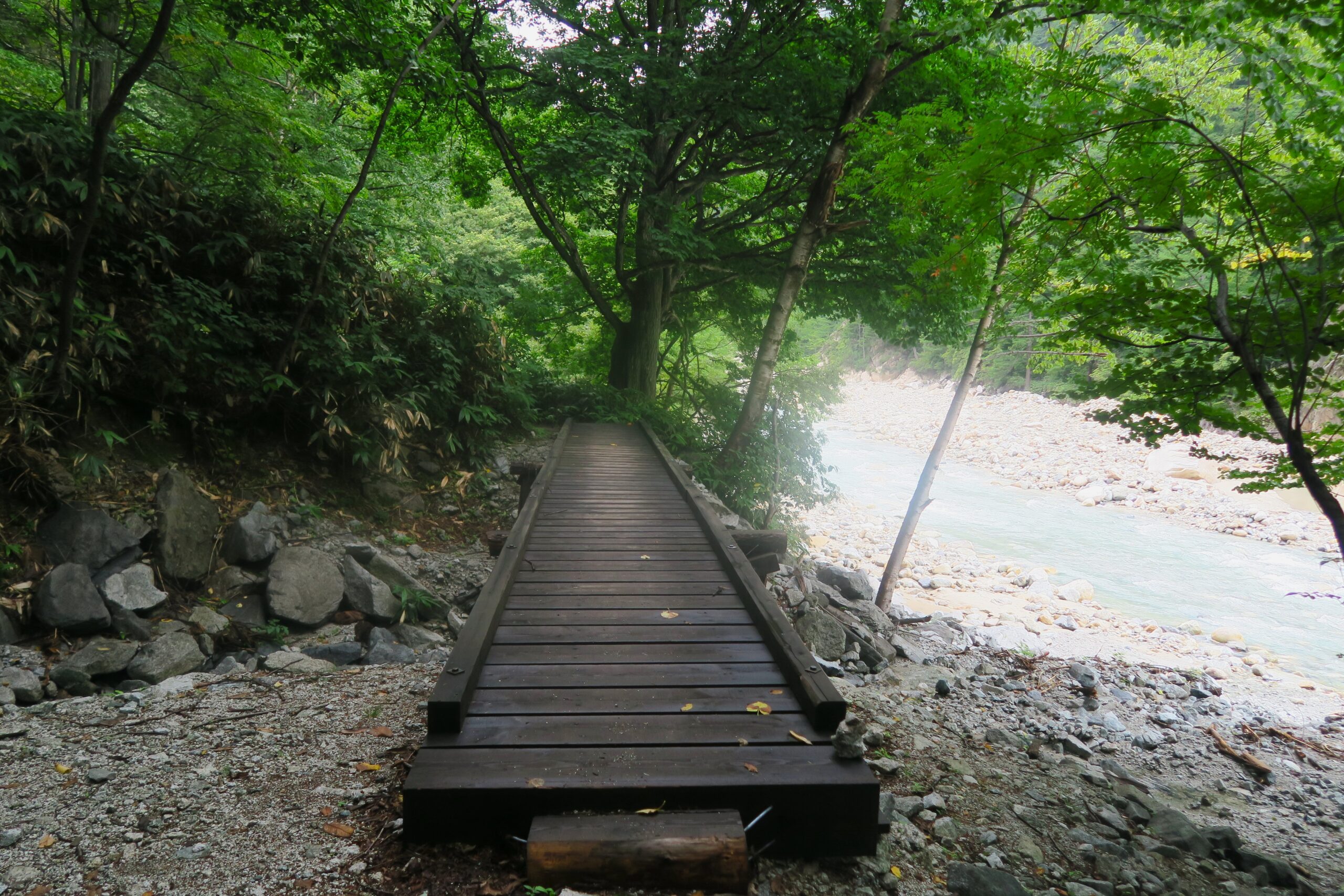 しかしながら登山道とはいえ、道はかつてのトロッコ道なので、右下に渓谷を眺めながらシラカバ、ブナ、ミズナラと植生豊かな広葉樹林の緑のトンネルを歩く渓谷沿いのほぼ平坦で軽快な道です。木漏れ日も清々しく、沢を渡る難所にも随所に橋や木道が架かっていてきちんと整備されており歩きやすい。なにより息を切らす箇所がなく、断崖や流れ落ちる木など風景に飽きることがなく、快適に晴嵐荘までの2時間を歩けるのが嬉しい。
