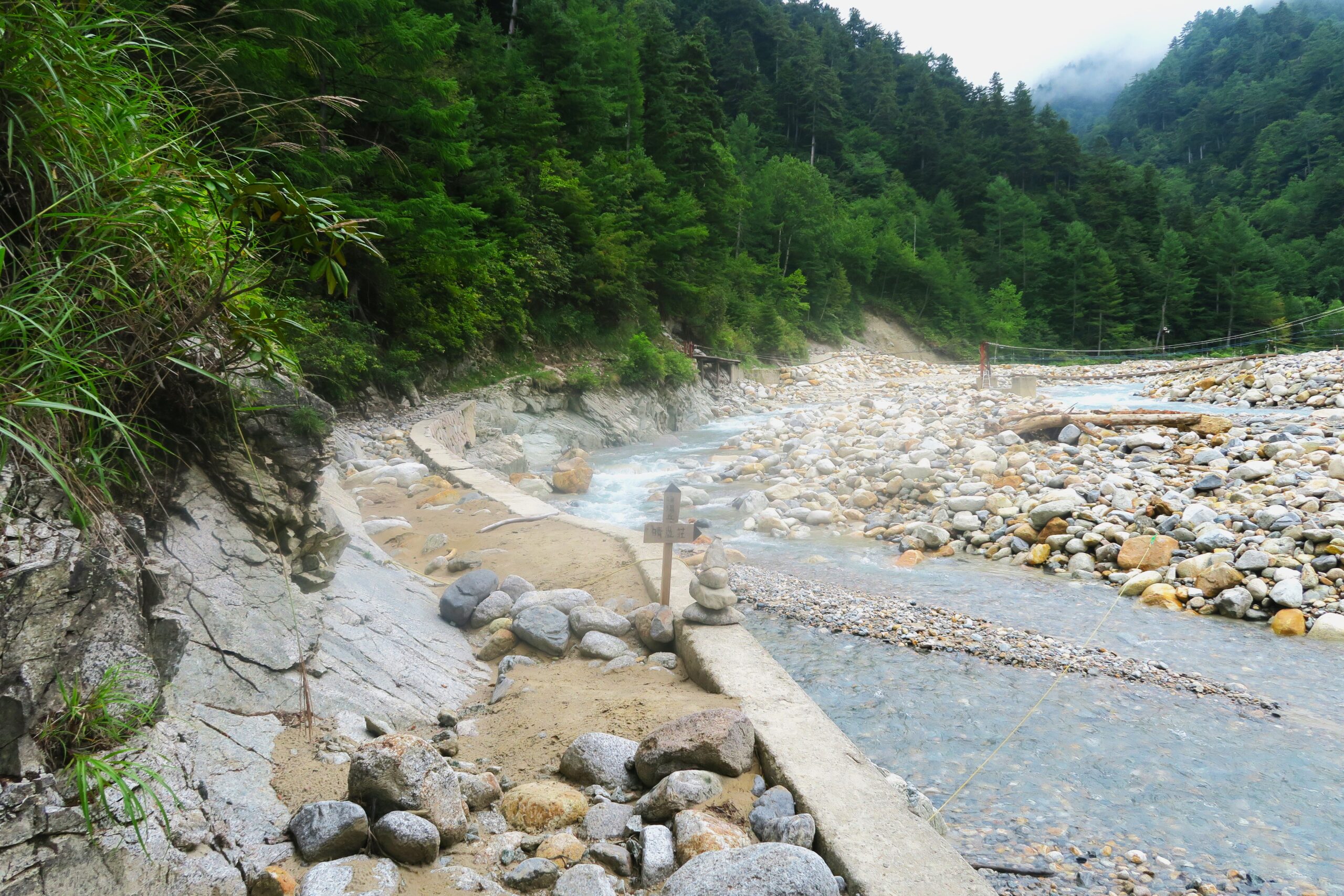 戻って晴嵐荘に立ち寄ります。平成30年7月上旬、西日本を中心に全国を襲った「西日本豪雨」で晴嵐荘の目の前の高瀬川に架かる吊り橋が押し流されてしまい、今年新しく吊り橋が完成していたのです。しかしながら先日来の雨で水量が増し、晴嵐荘前の高瀬川が二手になっていて本流にはしっかり吊り橋が架かっているのですが、登山道手前の部分は渡渉になります。渡渉地点にはロープが張られているのでわかりやすく、さっそく靴をサンダルに履き替えて徒渉です。意を決して川に足を踏み入れて透明な清流を渡るのはむしろ気持ちが良いほどですが水はとても冷たく、汗ばんだ身が一瞬で引き締まります。(戻りは冷たさにも馴れてスムーズに徒渉)