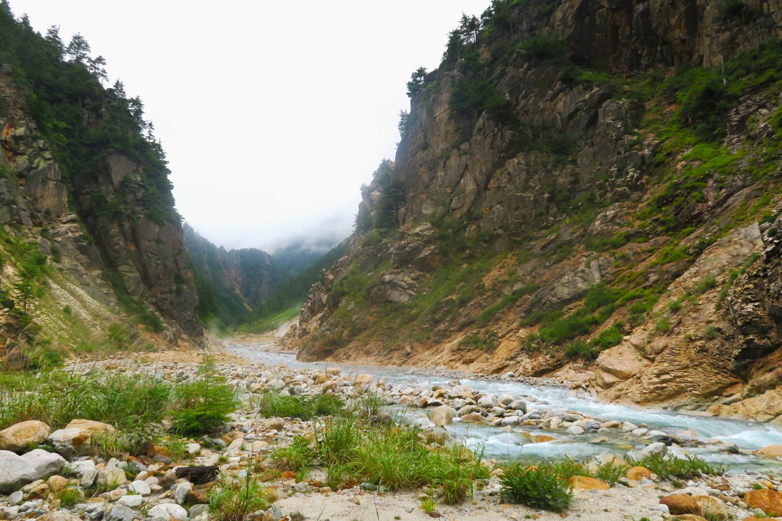 水門施設の裏側を過ぎ、渓谷沿いを立ち昇る湯気の方向を目指して進んでいきます。湯俣川を少し遡ると渓流の両岸には赤茶けた岩壁が荒々しく突き上げています。