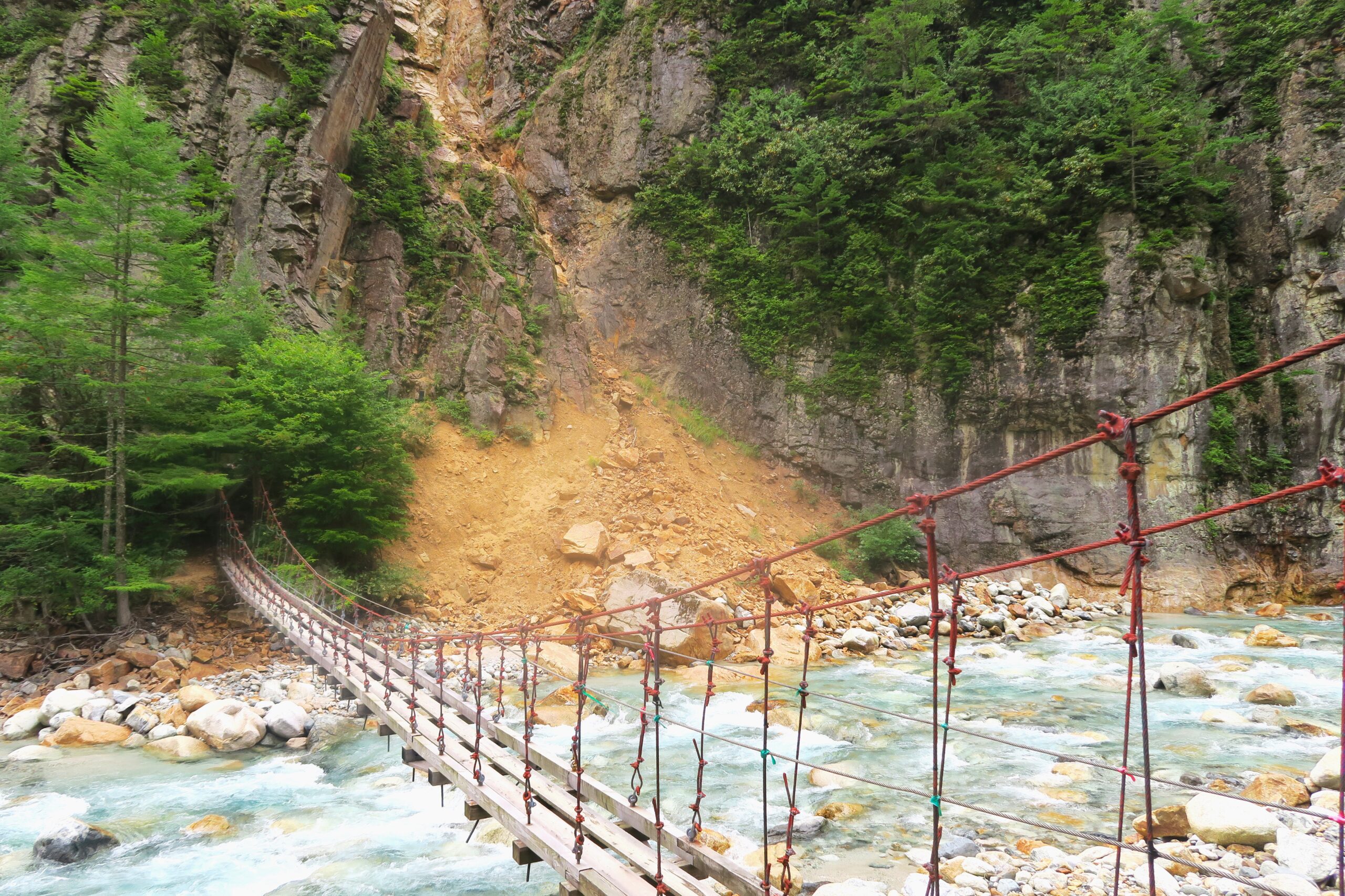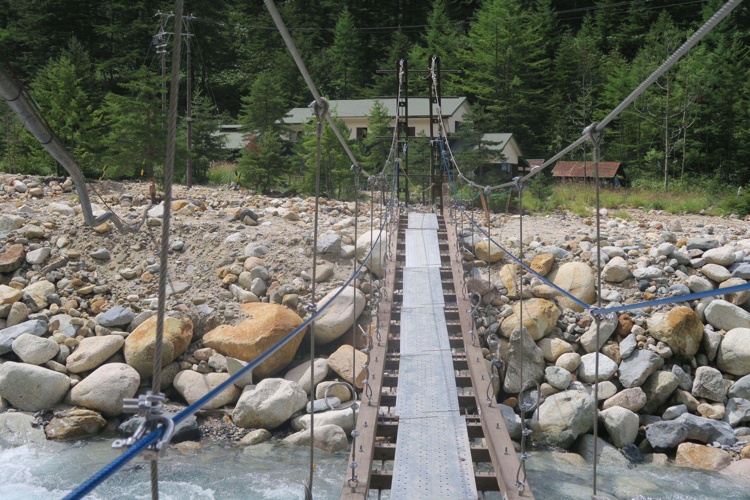 水俣川に架かる吊り橋を渡ります。橋を渡って左に行けば墳湯丘、右は槍ヶ岳北鎌尾根方面の登山道になります。