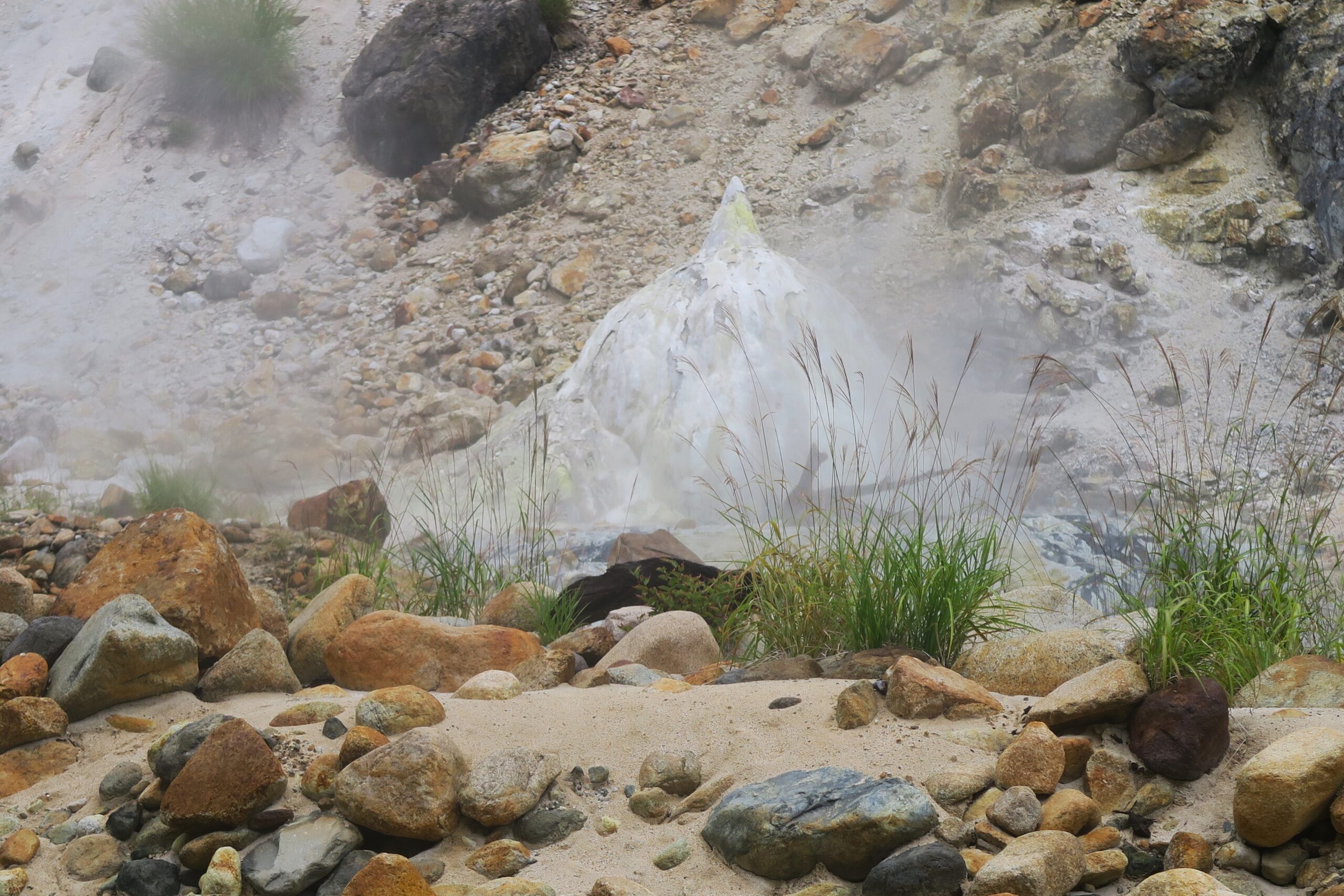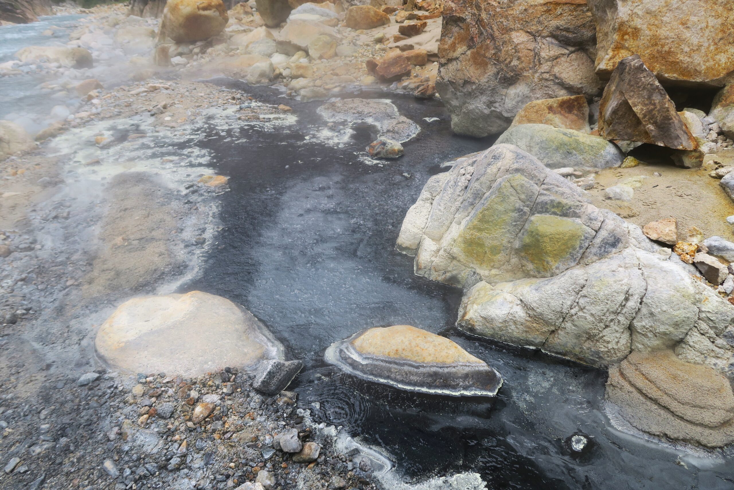 一帯を硫黄の臭いと共に白い湯気が立ち込める景色は圧巻です。先客の手作りの野天風呂の跡もあり、湯加減は引き込む川の水の量で調整します。ちょうどいい湯加減の場所を探して足湯を楽しんだり、もちろん素っ裸になって体を横たえることもできます。