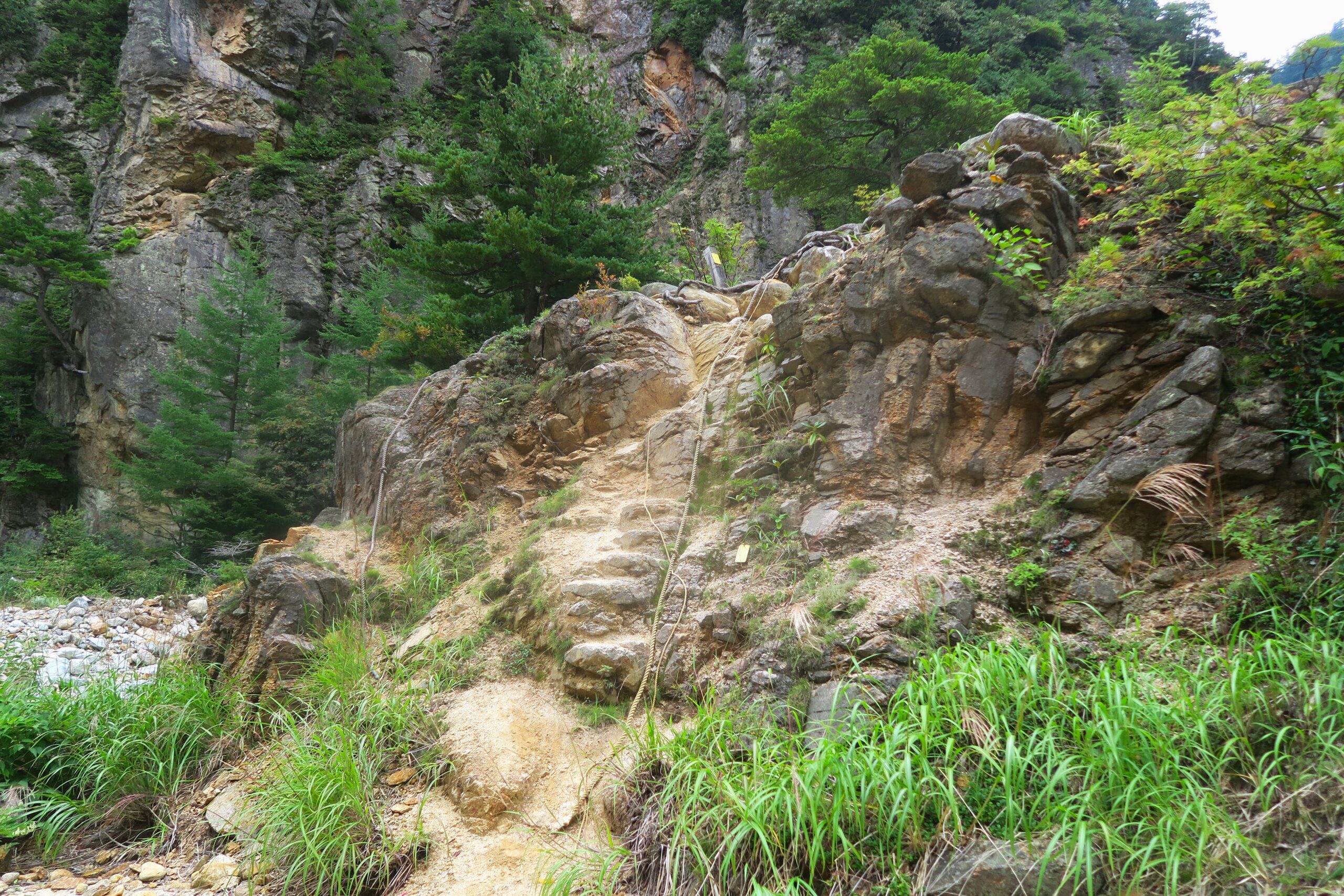 しばらく進むと祠があり、ロープを使って10mほどの崖を慎重に下ると温泉が湧く河原に着きます。