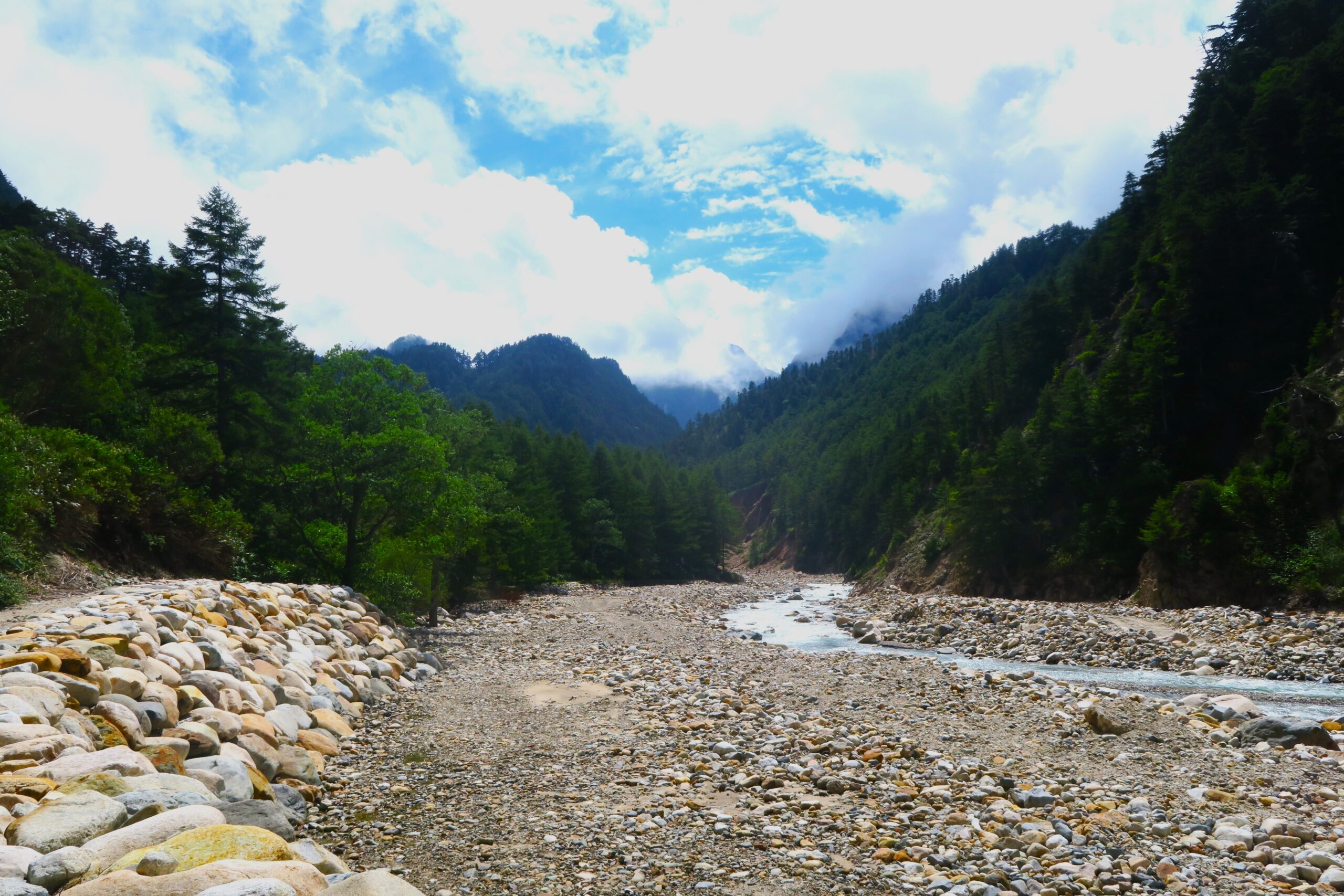 高瀬川の広い河原を上流へ向けて延々と遡って視界が開けた先、岸の反対側に晴嵐荘があります。後方には裏銀座方面の山が望め。宿の裏側から登れます。その手前には徒渉点と墳湯丘への標識がありますが立ち寄るのは後にして、ここから先、徒歩で15分ほどのところの天然記念物の墳湯丘を目指します。