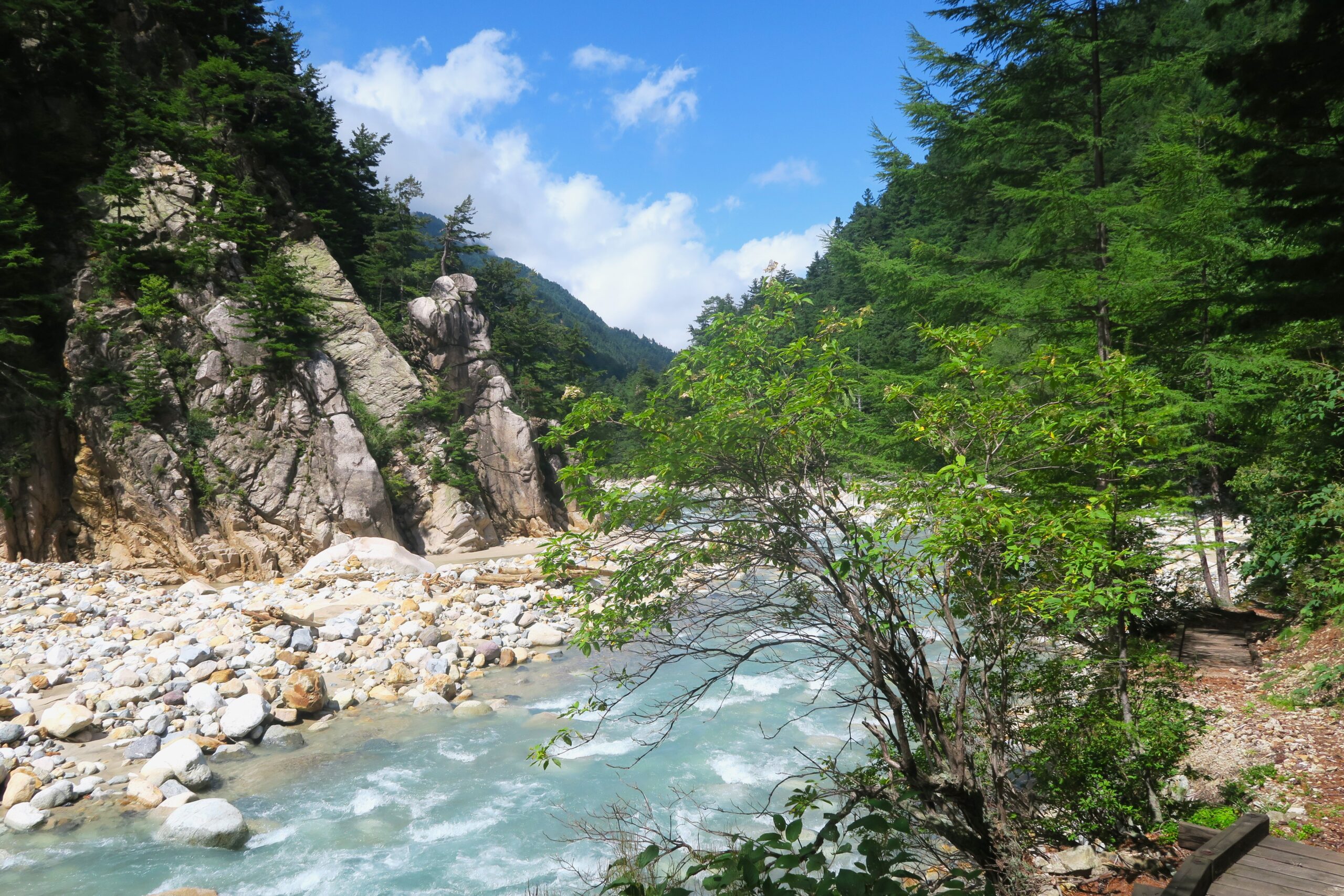 蝙蝠の住む薄暗い短いトンネルを抜けると森林の中を歩いてきた道が川沿いへと移ります。高瀬川の清らかな水の音に身も心も清々しく感じます。