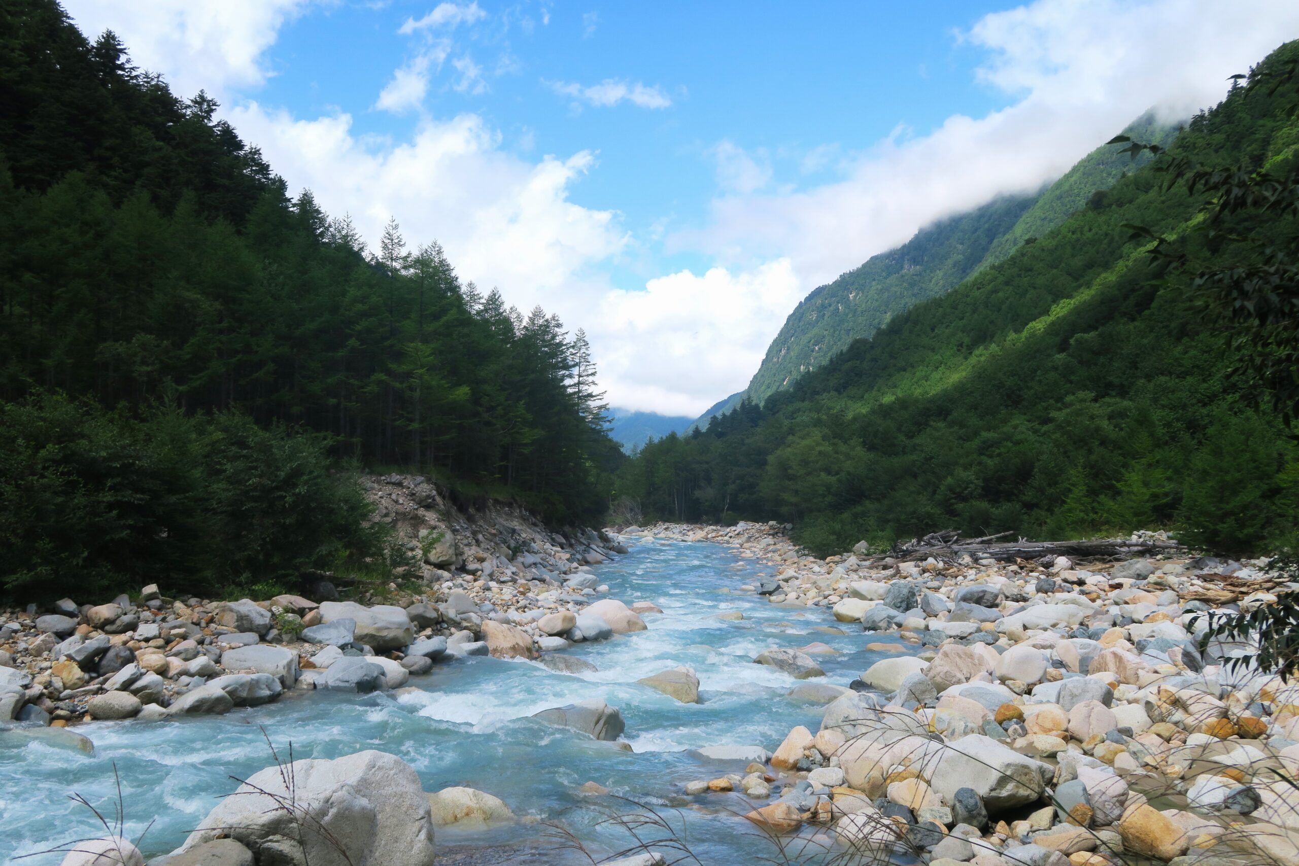 歩き始めて2時間、広々とした河原を見ながら進みます。地形図を見ると、野口五郎岳や燕岳、それに槍ヶ岳など北アルプスの名峰に囲まれた山域です。