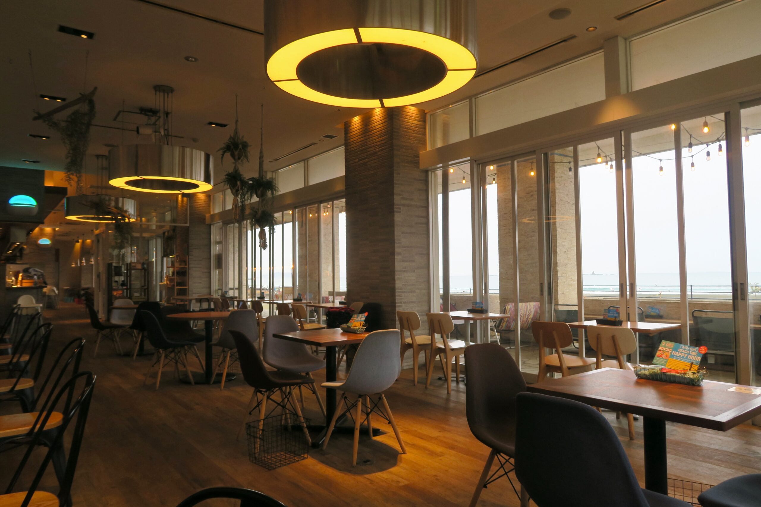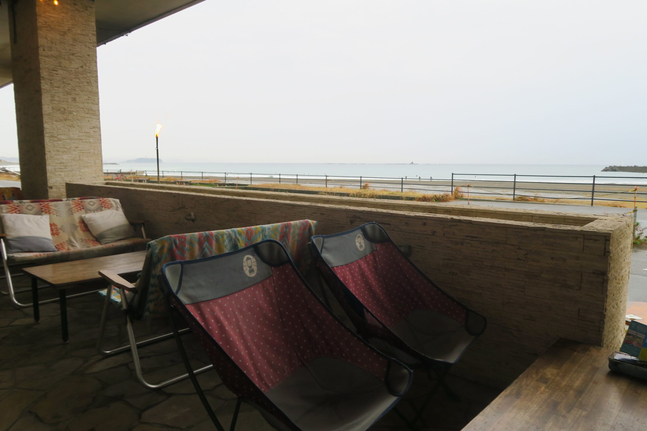1898年開設の茅ヶ崎海水浴場をサザンオールスターズの名にあやかり改名した「サザンビーチちがさき」に面したカフェのオープンデッキからはロコサーファーが波に興じ、遠くに烏帽子岩が見えます。