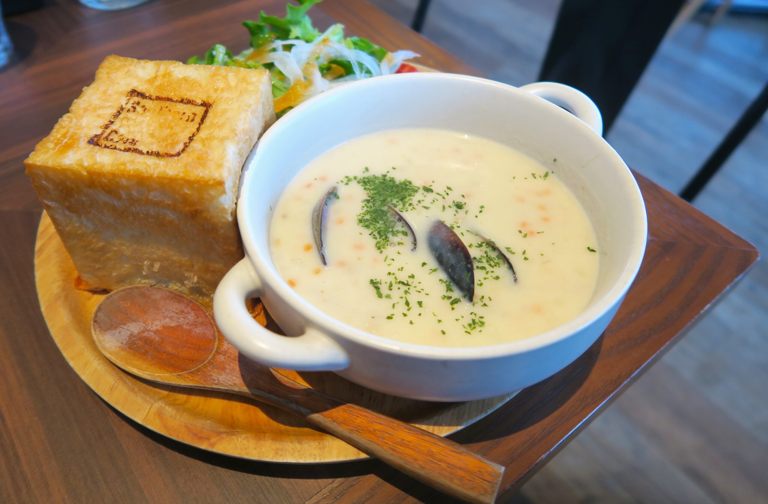 解放感に溢れた空間でモーニングをいただきながら時間がゆるやかに流れていきます。朝8:00からモーニングメニューから「自家製キューブパンとスープのプレート1280円を選択しました。ムール貝が2個入ったクラムチャウダーは大きめのスープボールにたっぷり入り、新鮮なサラダが彩を添えています。とSouthenBeachCafeと焼き印がおされたキューブパンはもっちりとした食感でスープにつけて食べればなお美味しいです。