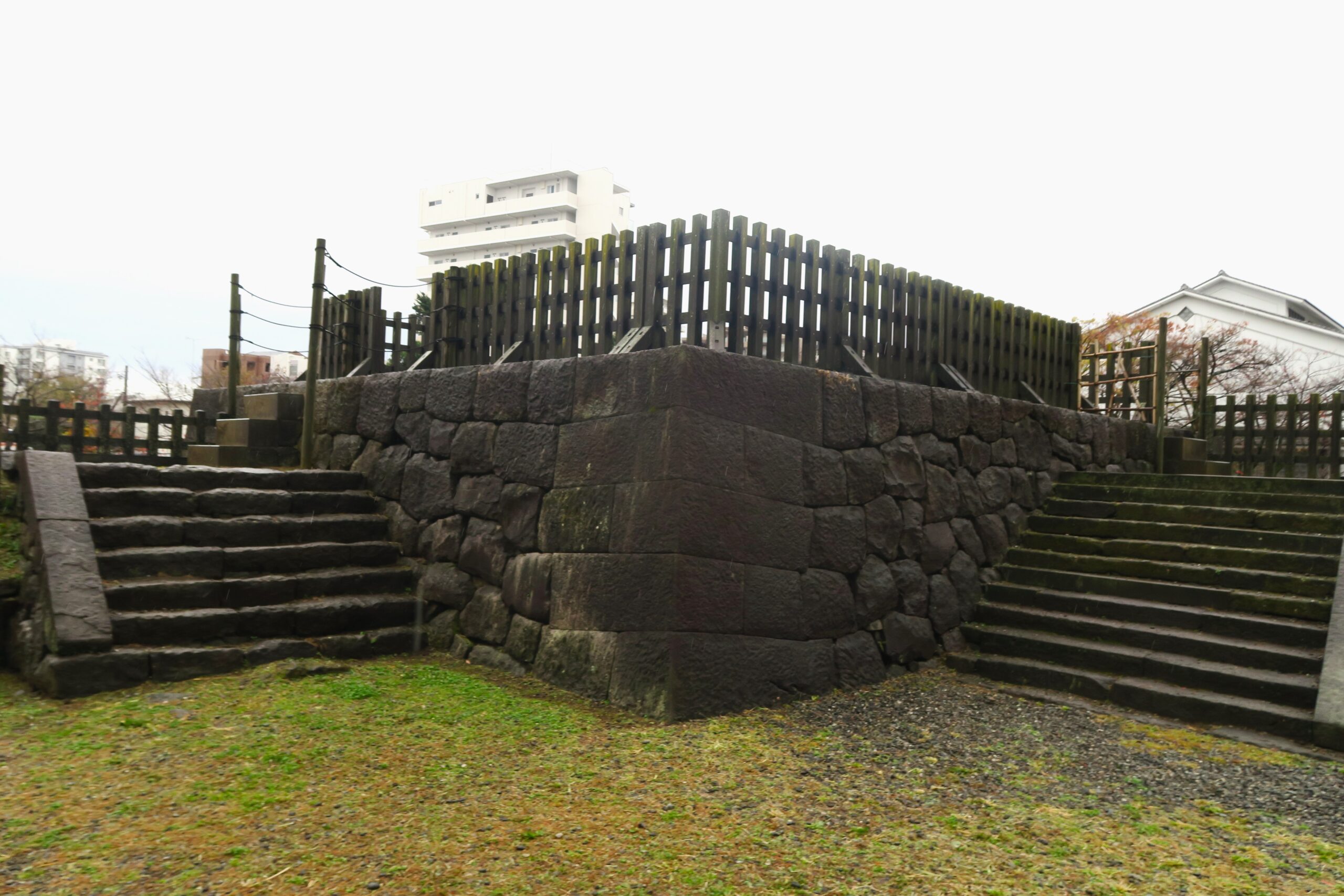 馬屋曲輪は寛永10年(1633)に馬をつなぐ「馬屋」が設置され、寛永20年(1643)には南東隅に2階建ての二重櫓が建てられていました。平成20、21年(2009、2010)に発掘調査が行われ櫓台石垣は南北約12.4m、東西約10.9mの長方形で石垣の高さは澤2.5mでした。また櫓台にはの西側と北側にそれぞれ石段が付けられていました。