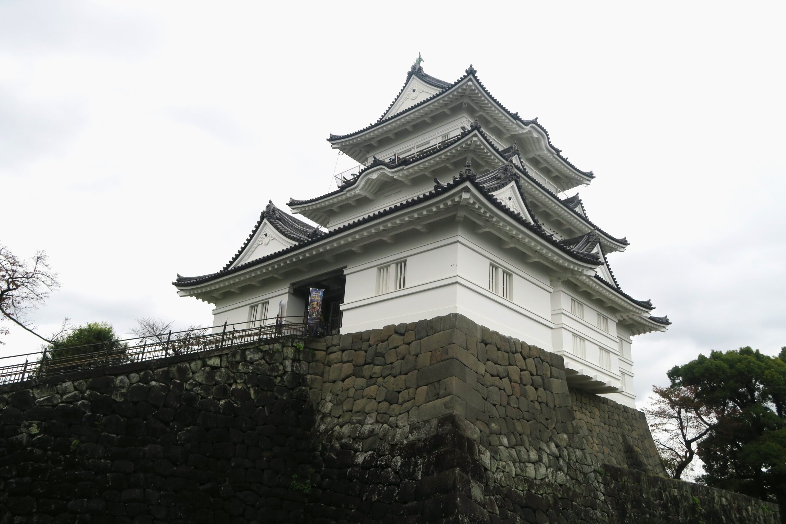 天守の内部では江戸時代から現代までの小田原城の歴史や小田原ゆかりの美術工芸を紹介していますが、標高約60mの最上階の展望デッキからは東から南にかけて相模湾が広がり、伊豆半島に伊豆大島、さらに西側にまわると箱根連山が外輪山の上に並び立っています。やはりここが交通・軍略上の要衡であることがうかがえます。史上名高い豊臣秀吉の一夜城の跡、箱根外輪山の手前にあるなだらかな山並みも望めます。