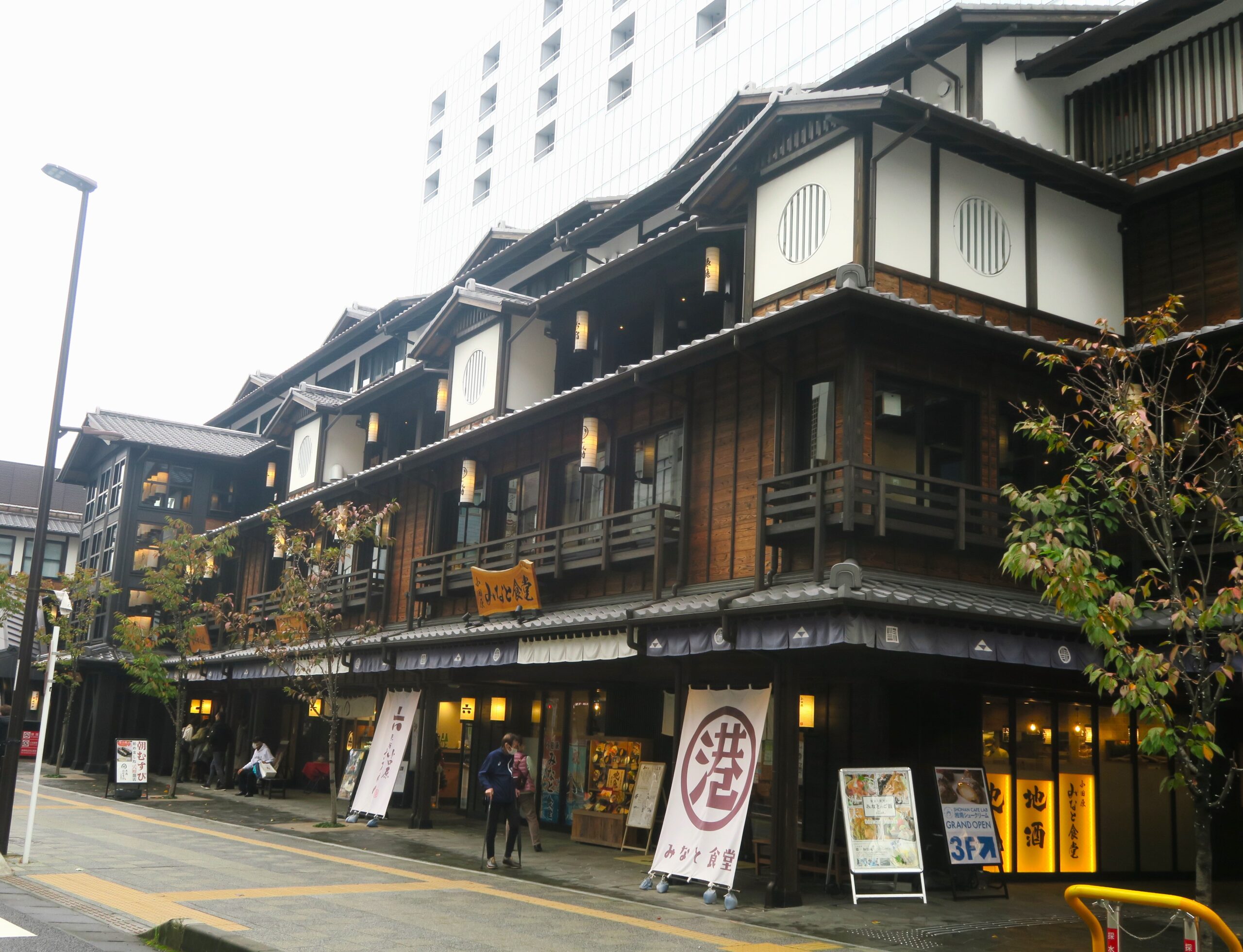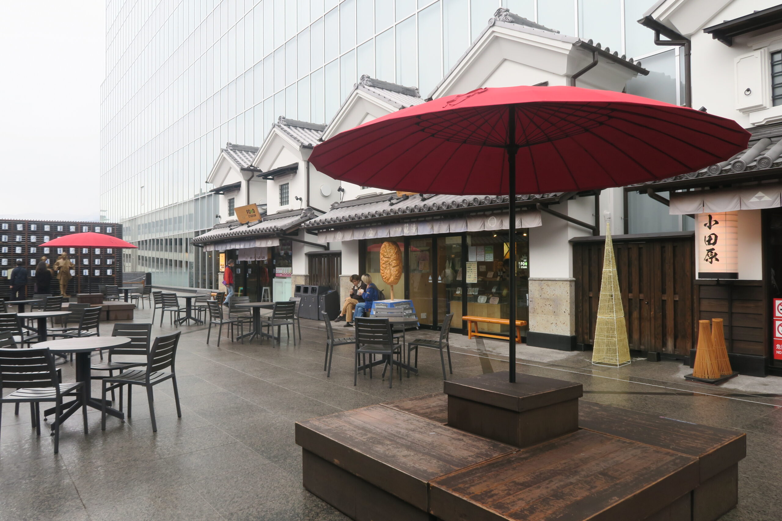 その前小田原の食を味わおうと、3階の金次郎広場へ。江戸時代の東海道の宿場町として栄えた往時の賑わいが再現されたかのような空間です。