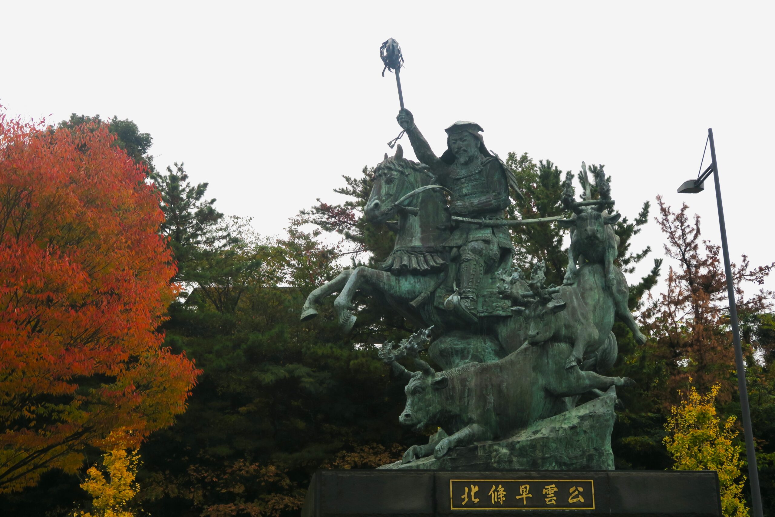 海沿いを走る国道134号から西湘バイパスを走り、一路小田原を目指し早川ICを出ます。関東の覇者として権勢を誇った北条氏の居城・小田原城は、城下町を丸ごとすっぽり囲った全長9kmに及ぶ総構の守られた戦国時代屈指の大要塞でした。関東一円を治めた戦国一の城郭都市小田原の繁栄は北条早雲から始まるということで、まずは小田原駅西口広場のロータリーに立つ北条早雲公像に御挨拶です。自らの力で大名になり“最初の戦国大名”ともいわれる北条早雲公像は、高さ5.7m、重さ7tの大きさで鎧兜を身に着けた凛々しい騎馬姿で「火牛の計」をモチーフにした角に松明を付けた牛を率いています。これは北条早雲が小田原城を奪取した時の姿をとらえたもので、『北条記』『北条五代記』など、江戸時代の軍記物語からの典拠となっています。