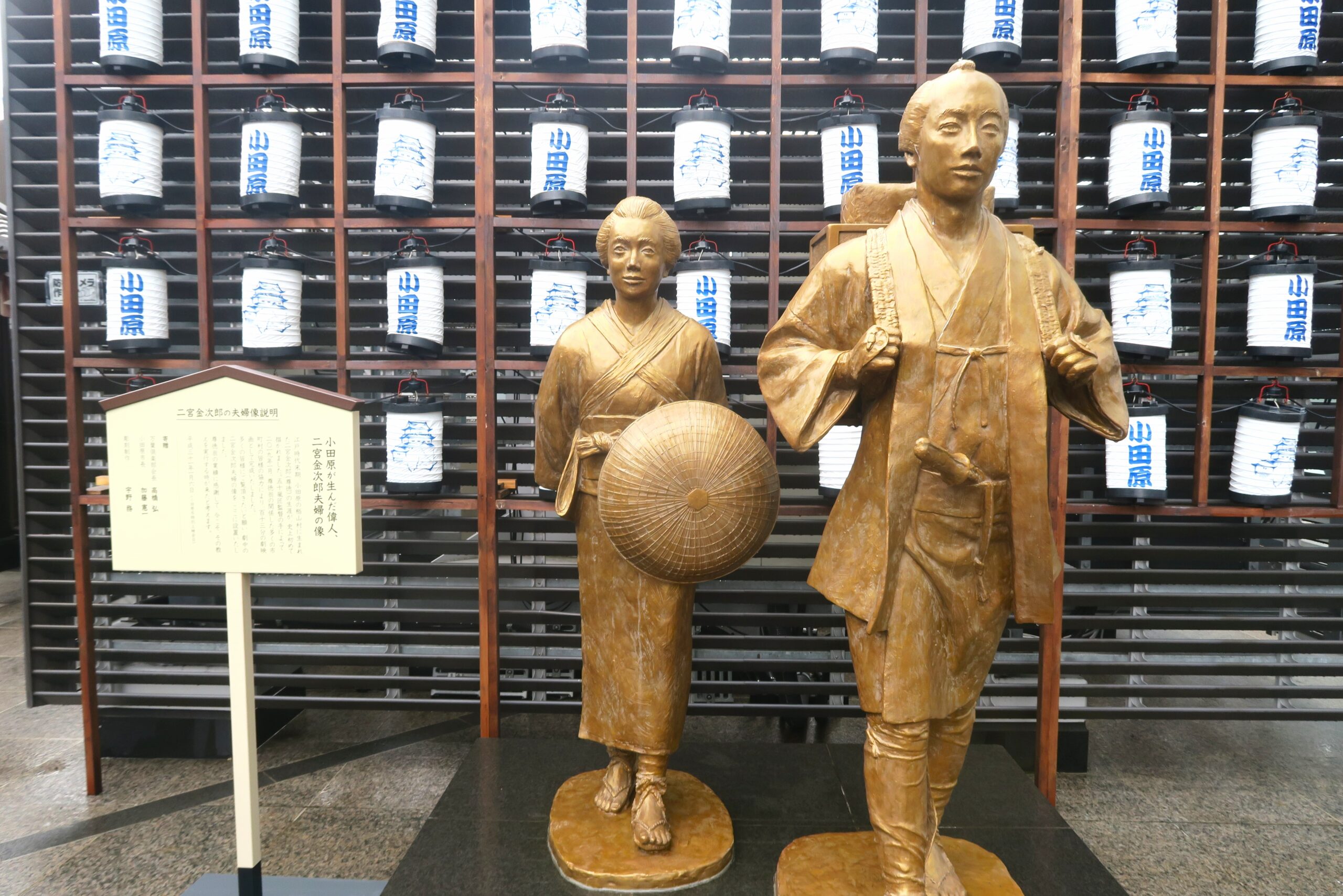 小田原出身の偉人・二宮金次郎の名にちなんで命名されました。映画「二宮金次郎(2019)」を記念して劇中の二宮金次郎夫婦の像をここに設置したとのことです。劇中では二宮金次郎を合田雅吏、妻なみに田中美里が演じています。