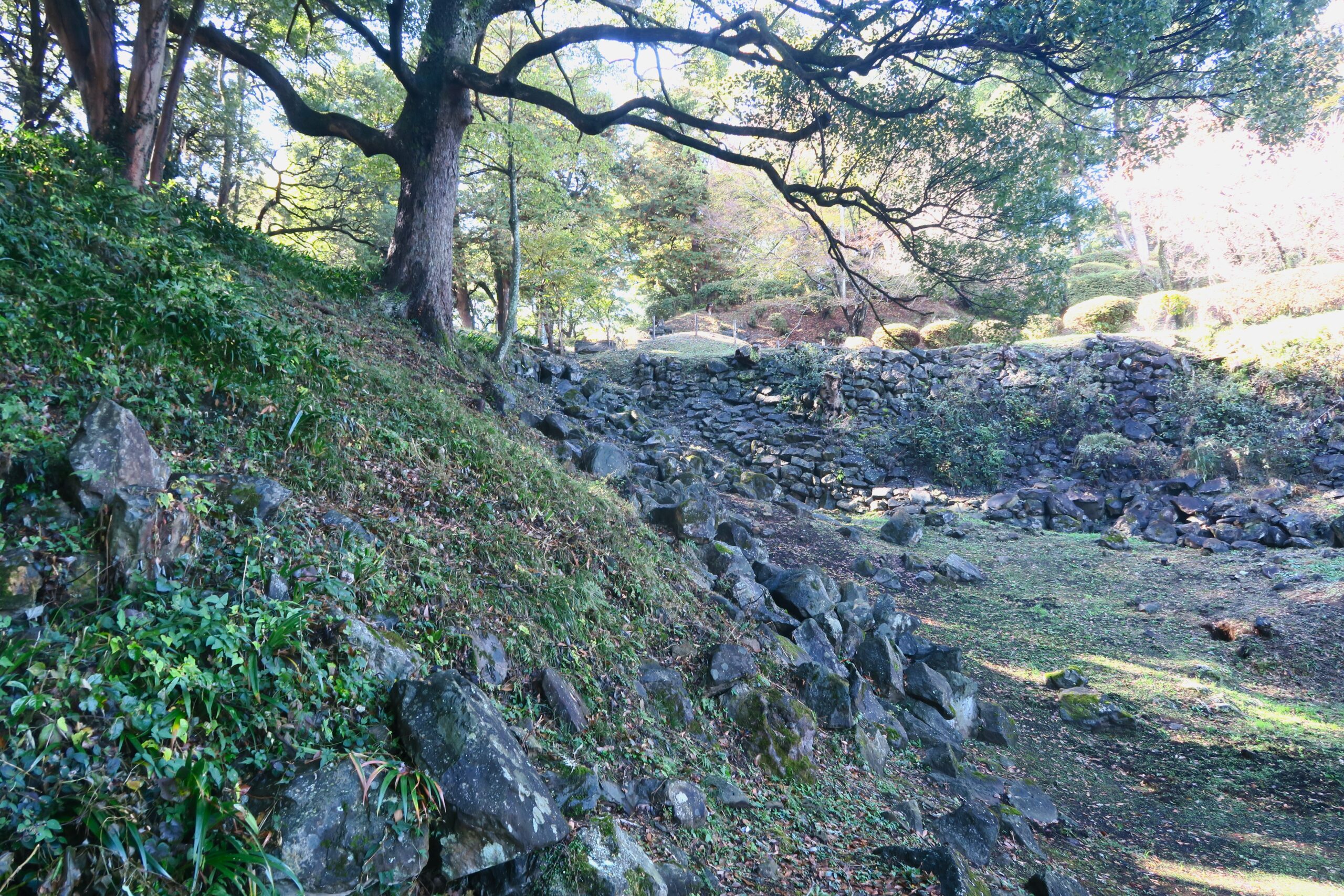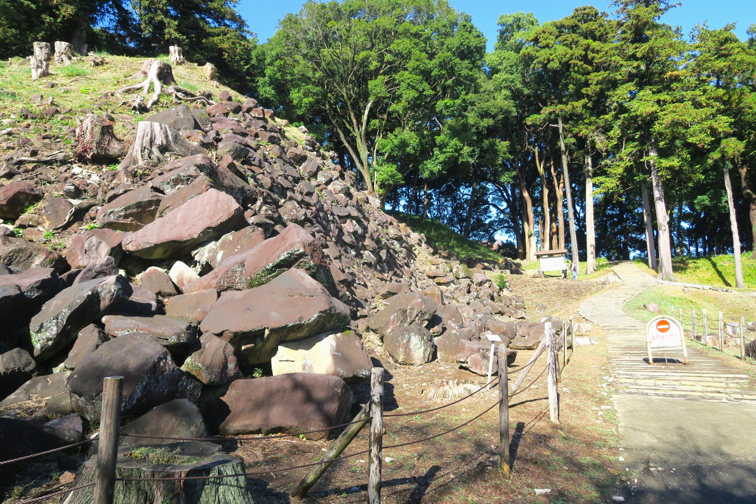 現在、一夜城は東日本初の総石垣造りで近江の穴太衆が造った野面積みの石垣が今に残り続日本100名城に選定され、石垣山一夜城歴史公園として整備されています。関東初の総石垣の城として知られていますが、大正12年(1923)の関東大震災で大部分に石垣が崩れてしまい、今も崩れた石が山中にたくさん転がっています。城の構造は本丸や二の丸、三の丸が梯郭式に配列されたシンプルなもので、本丸南側には5層の天守があったとされる天守台跡があります。。南曲輪や巨大な井戸曲輪にも石垣が用いられていたなど遺構が残ります。