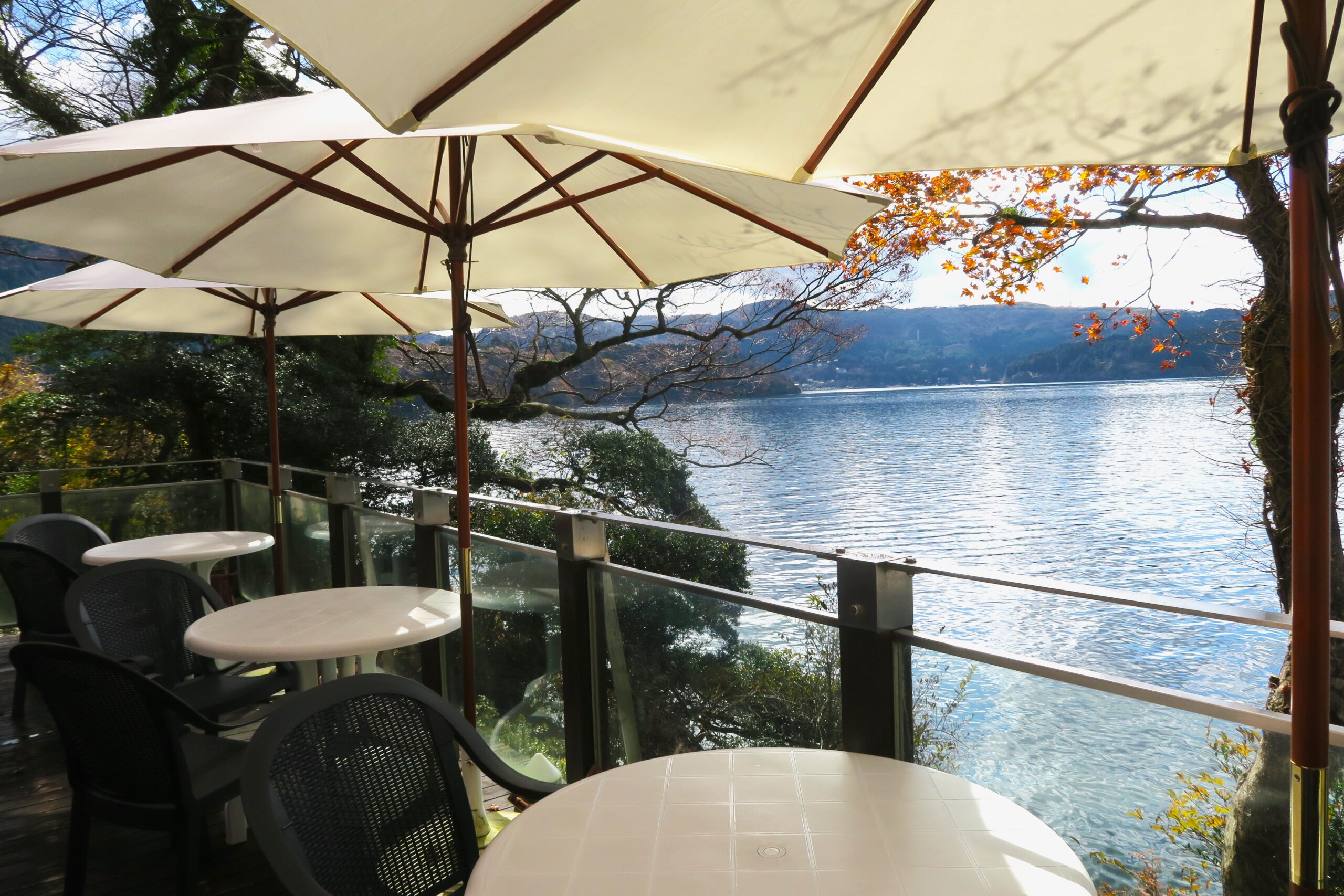 平和の鳥居から歩いて5分ぐらいのところ、芦ノ湖に突き出すように佇む湖畔のカフェ「サロン・ド・テロサージュ」があります。はす向かいに立つ小田急山の上ホテル直営のカフェ&レストランで、芦ノ湖に迫り出すテラス席で外輪山に囲まれた湖を眺めrながら贅沢なスイーツをいただきます。