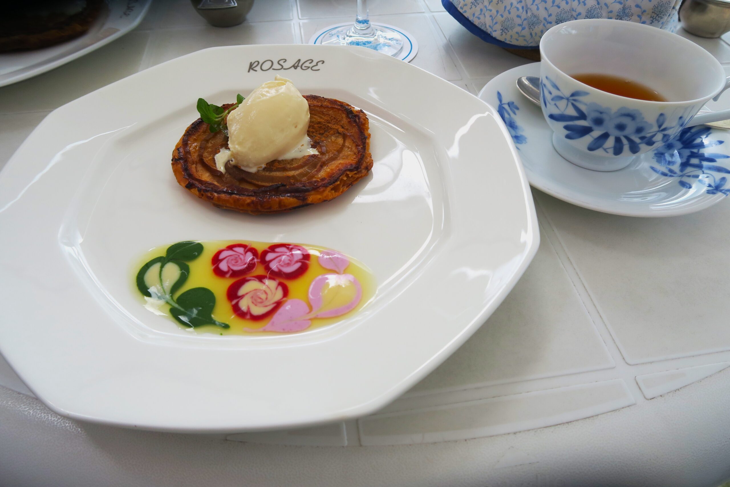 ここでいただく看板スイーツは、眺望の美しさにも勝る芸術的なりんごパイ。薄くスライスしたリンゴをのせて注文ごとに焼き上げるアツアツのパイの上にバニラアイスをのせ、5色のフルーツソースを使って、目の前でプレートに花びらなど描いてドレッサージュしたら完成です。