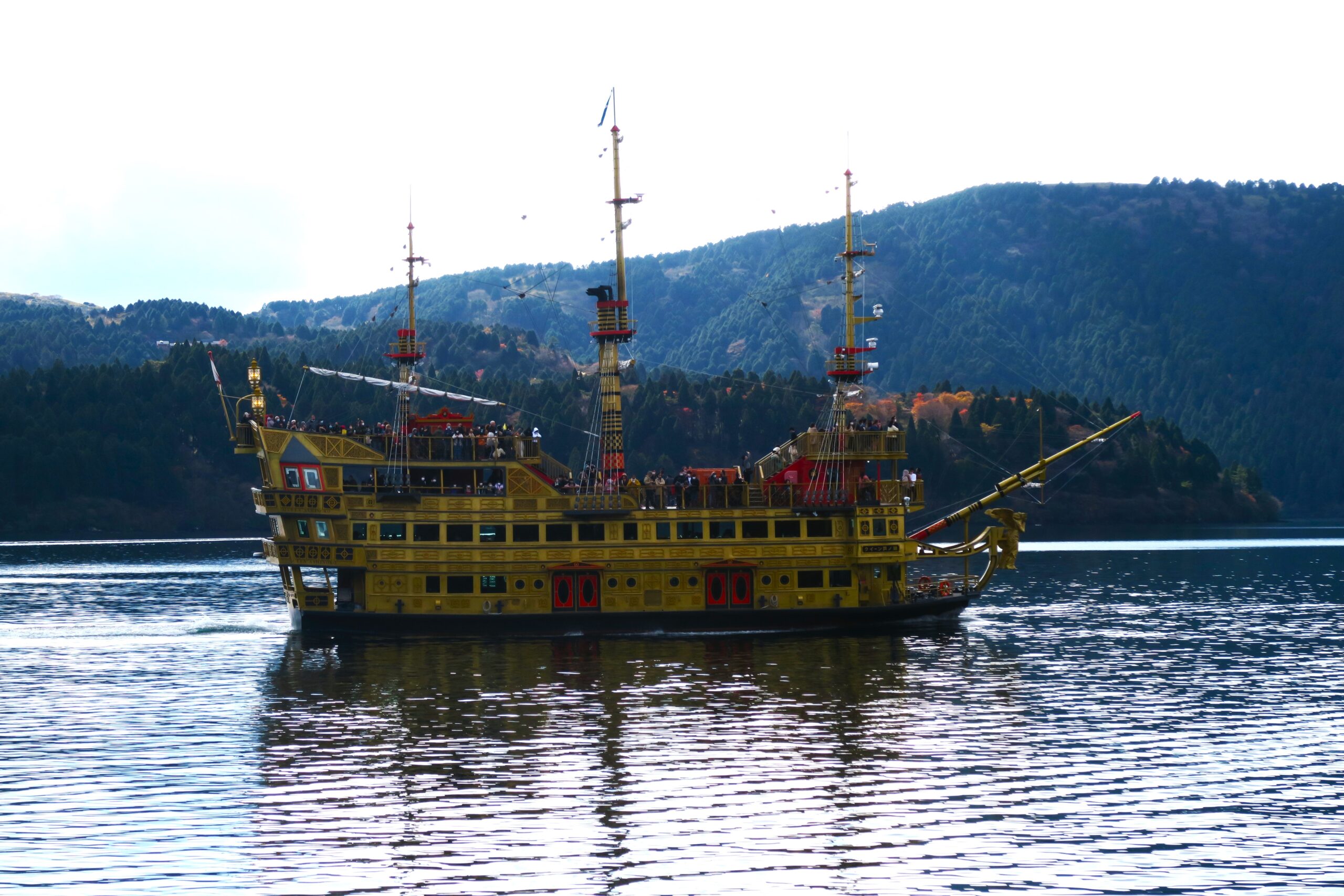 2019年に就航した芦ノ湖の海賊船「クィーン芦ノ湖」がゆっくりと目の前を海上を進んでいます。豪華観光列車の数々をデザインしたことで知られる水戸岡鋭治氏が手掛けた船です。