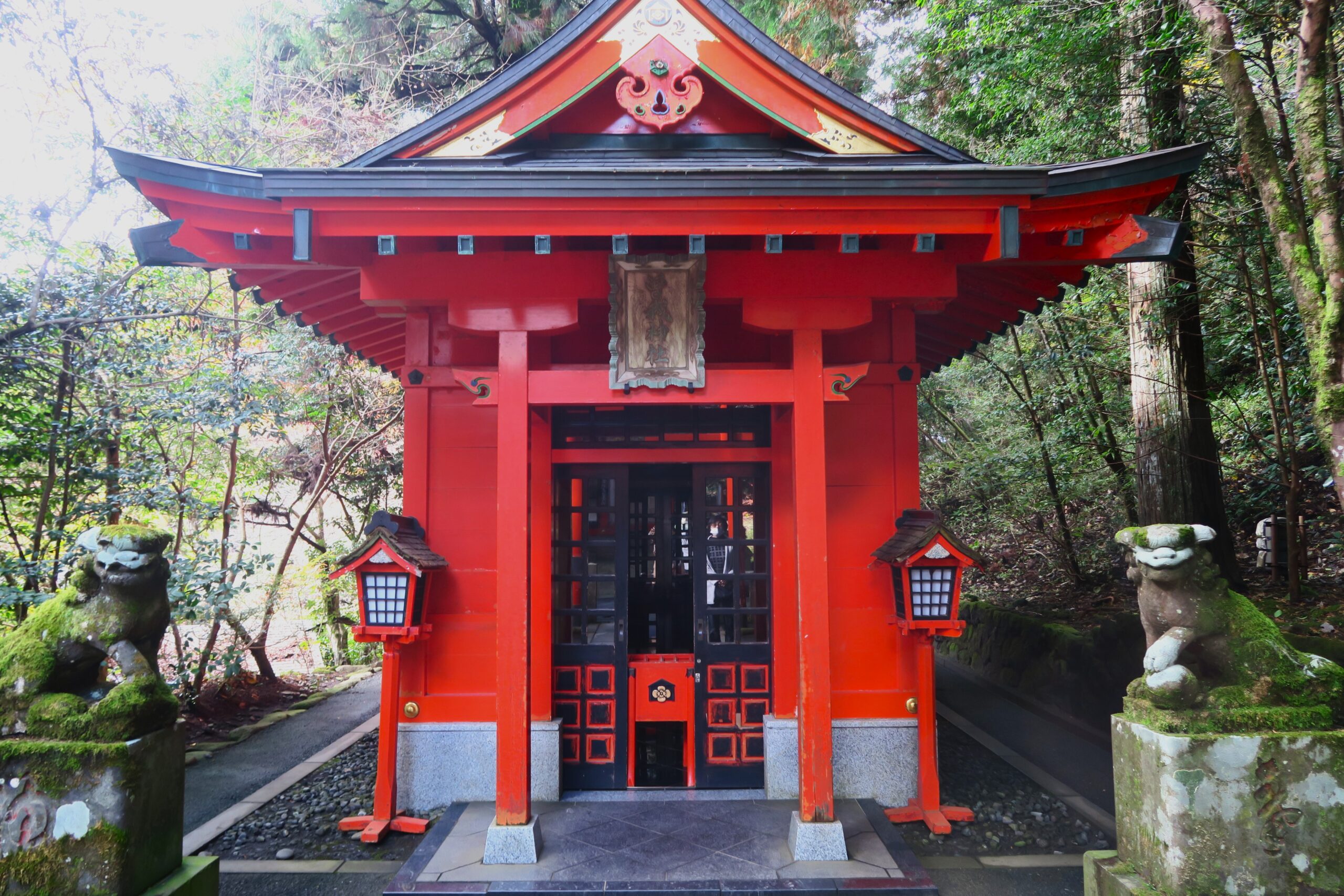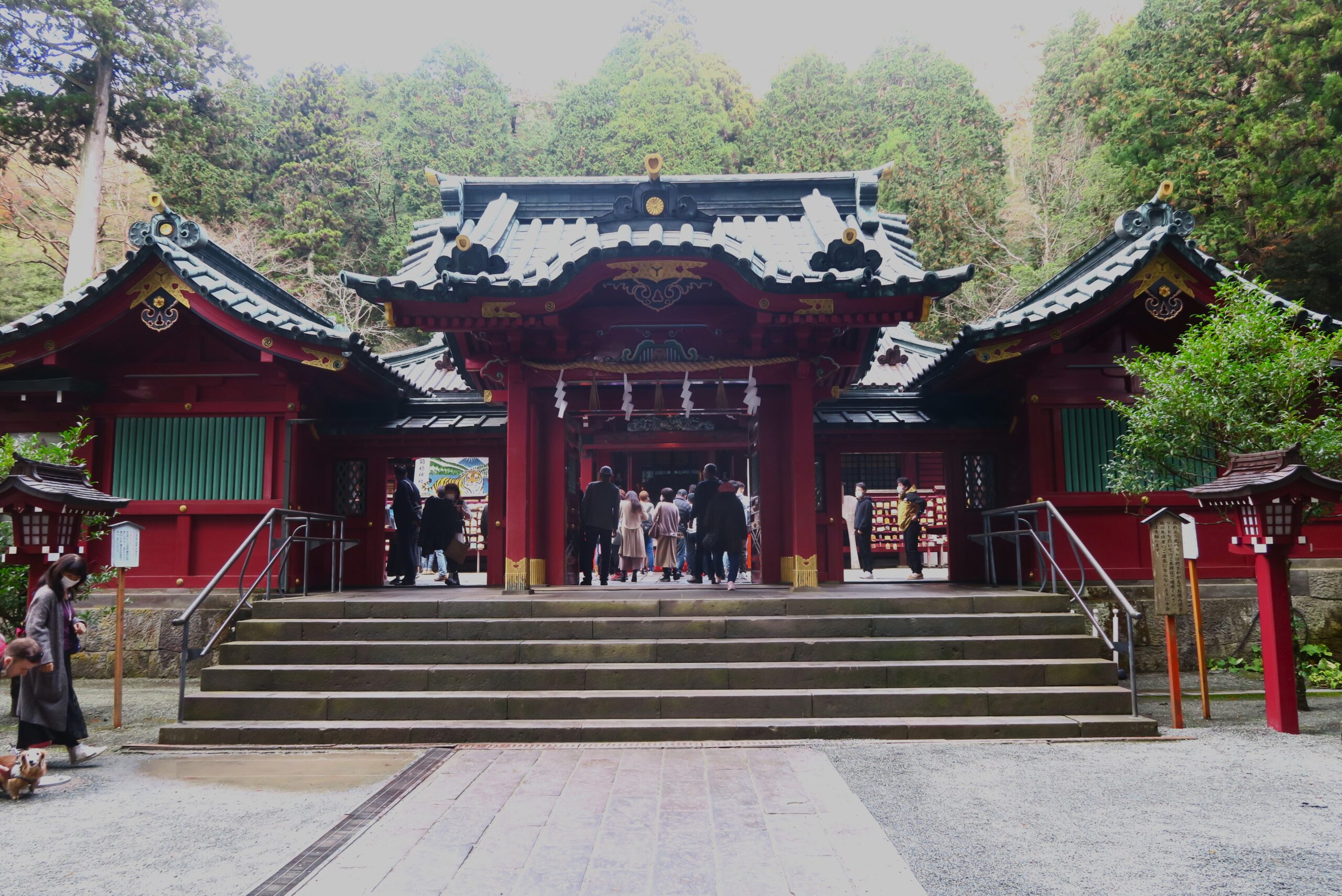 祭神は箱根大神で瓊瓊杵尊、木花咲耶姫命、彦火火出見尊の御三神の総称です。朱塗りの権現造りの社殿の背後には、ヒメシャラの樹林広がります。