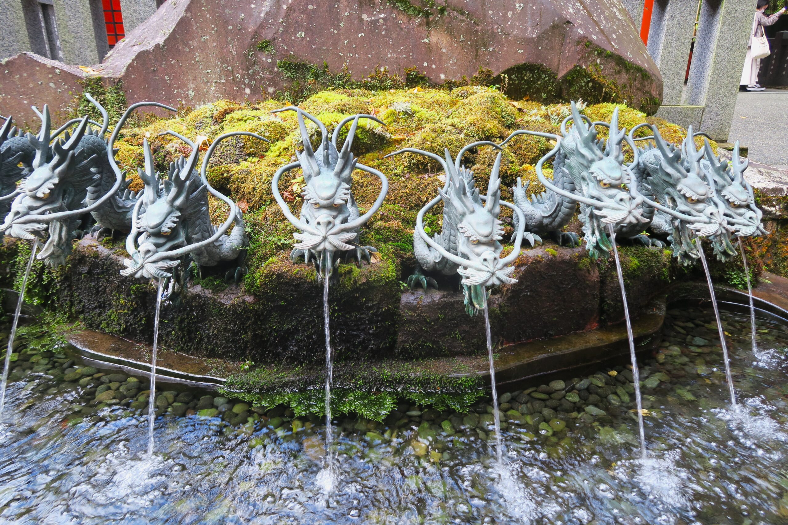 さらに、運気をアップしたい人は、社殿前の「龍神水」も忘れずに。「龍神水舎」には九つの龍の口から「龍神水」と呼ばれる霊水が流れ出ていて、社務所で龍神水持ち帰り用のペットボトルが販売されているので汲むことができます。芦ノ湖の水源のほとんどは湖底から湧く地下水とされ、この龍神水は自身の中の不浄を浄化し、良いものを引き寄せるといわれます。