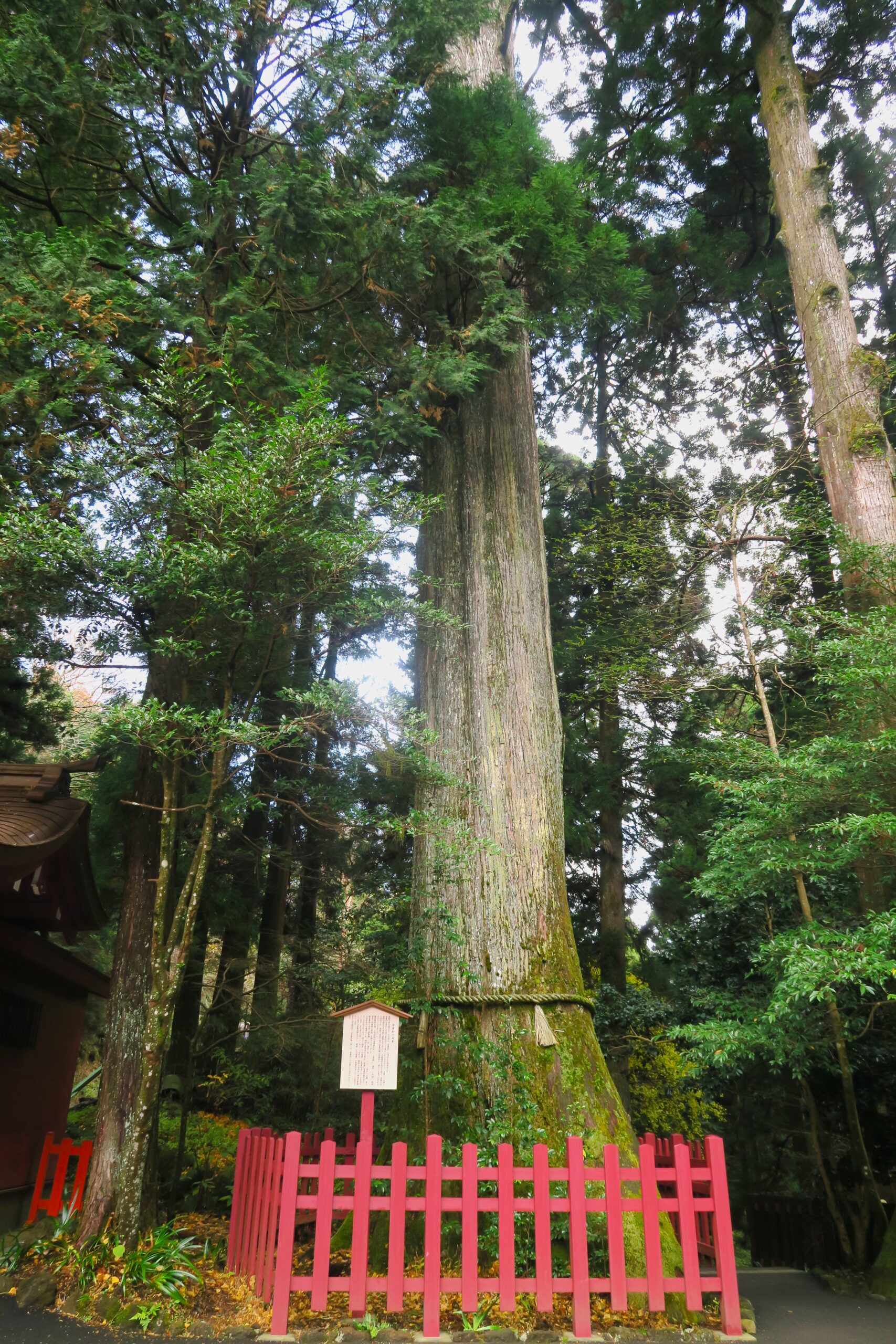 年に一度の大御祭である湖水祭の翌日、この地方を襲った台風で湖が荒れた日に浮上してきたもので、箱根の大神の神力を得た万巻上人が毒龍調伏の折にこの木につなぎ、芦ノ湖の守護神「九頭龍神」を誕生させた逸話にでてくる「栴檀伽羅木」であろうとされて、境内に遷され祀られています。湖中には今なお千古の謎を秘めて、錫杖杉、故杉、影向杉があり、栴檀伽羅木を含めて芦ノ湖の五名木と呼ばれています。その質感と大きさに圧倒されます。