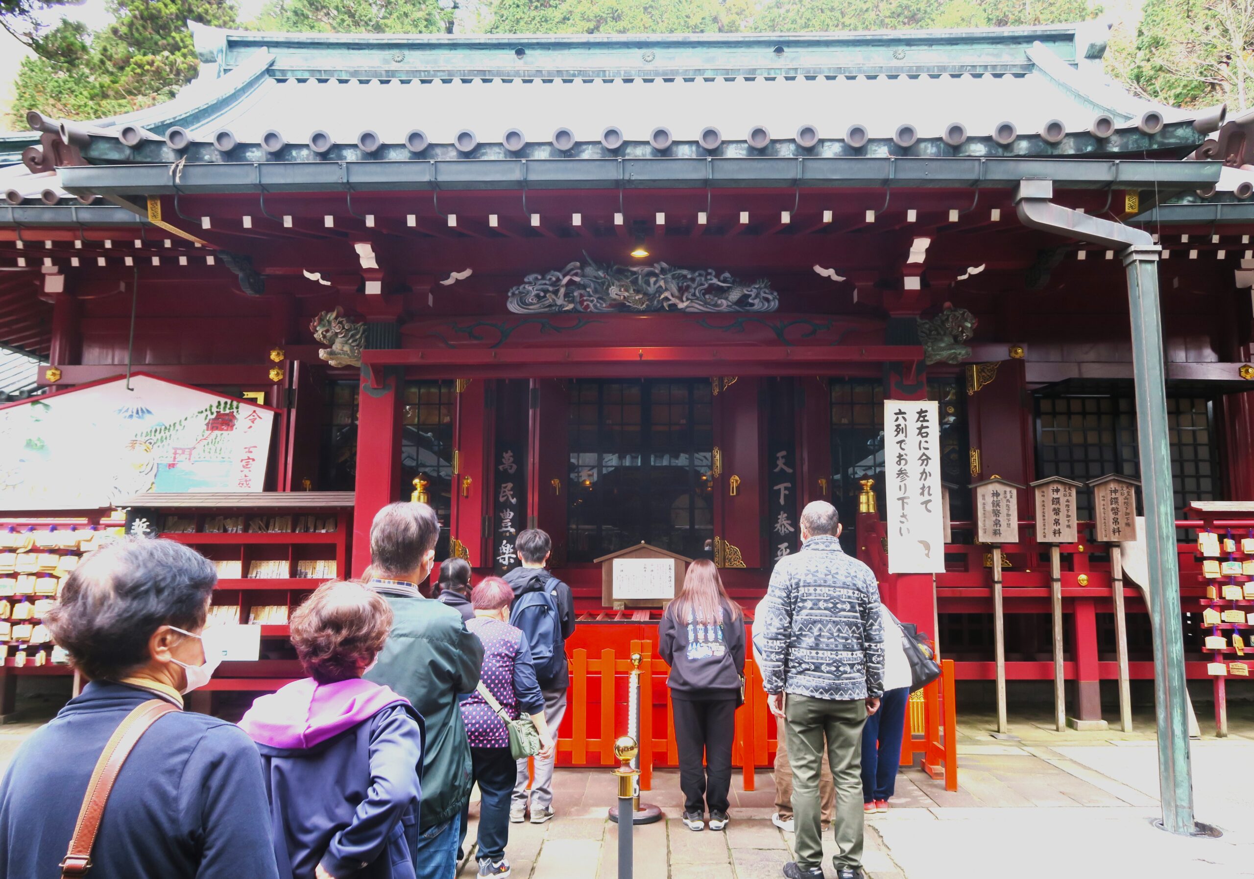 箱根神社への正参道は第四鳥居から両側に老杉の巨木が聳え並び、森巌な佇まいを見せています。89段、厄落としの階段を上っていき、第五の鳥居をくぐれば、正面に朱塗りの箱根神社御社殿です。