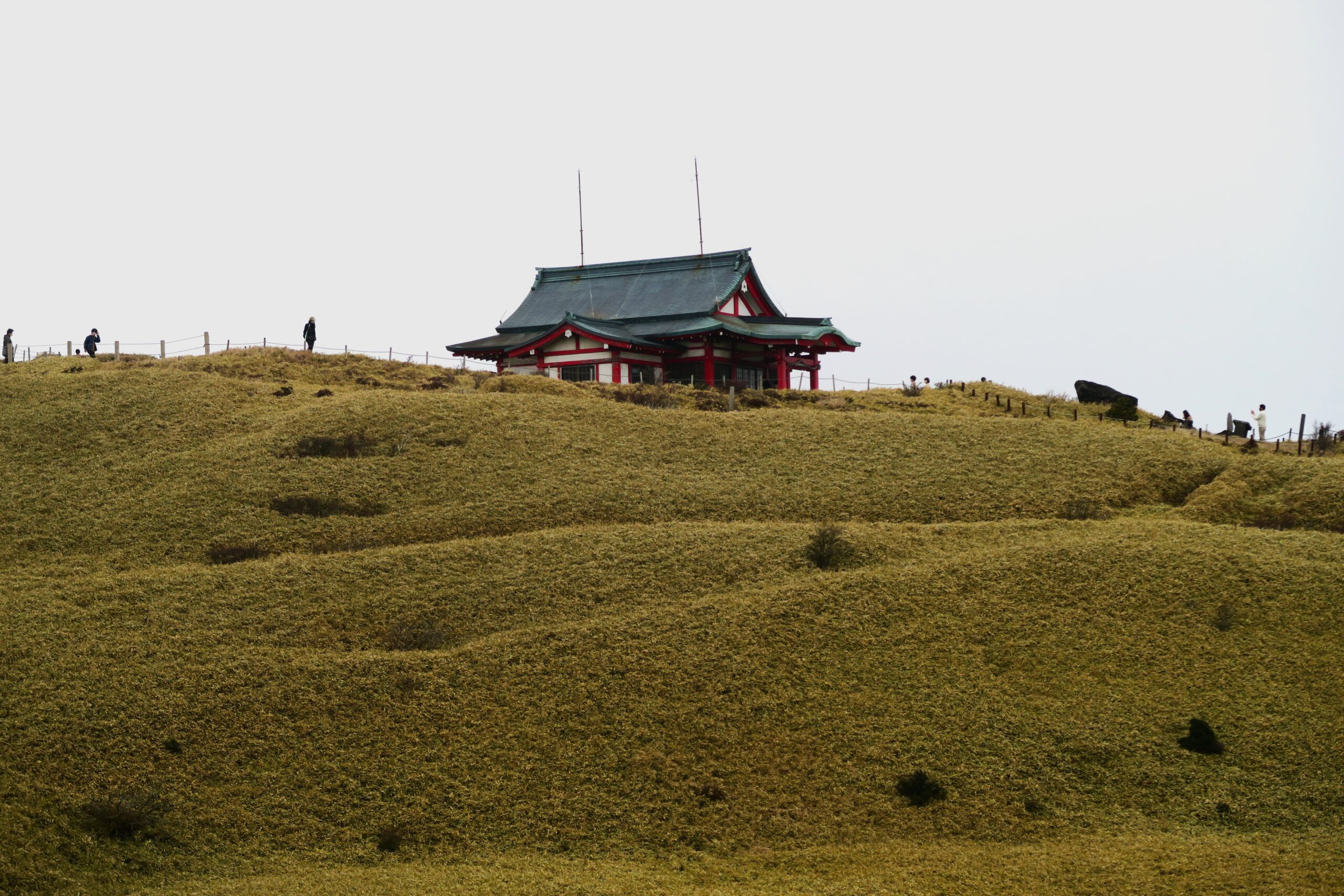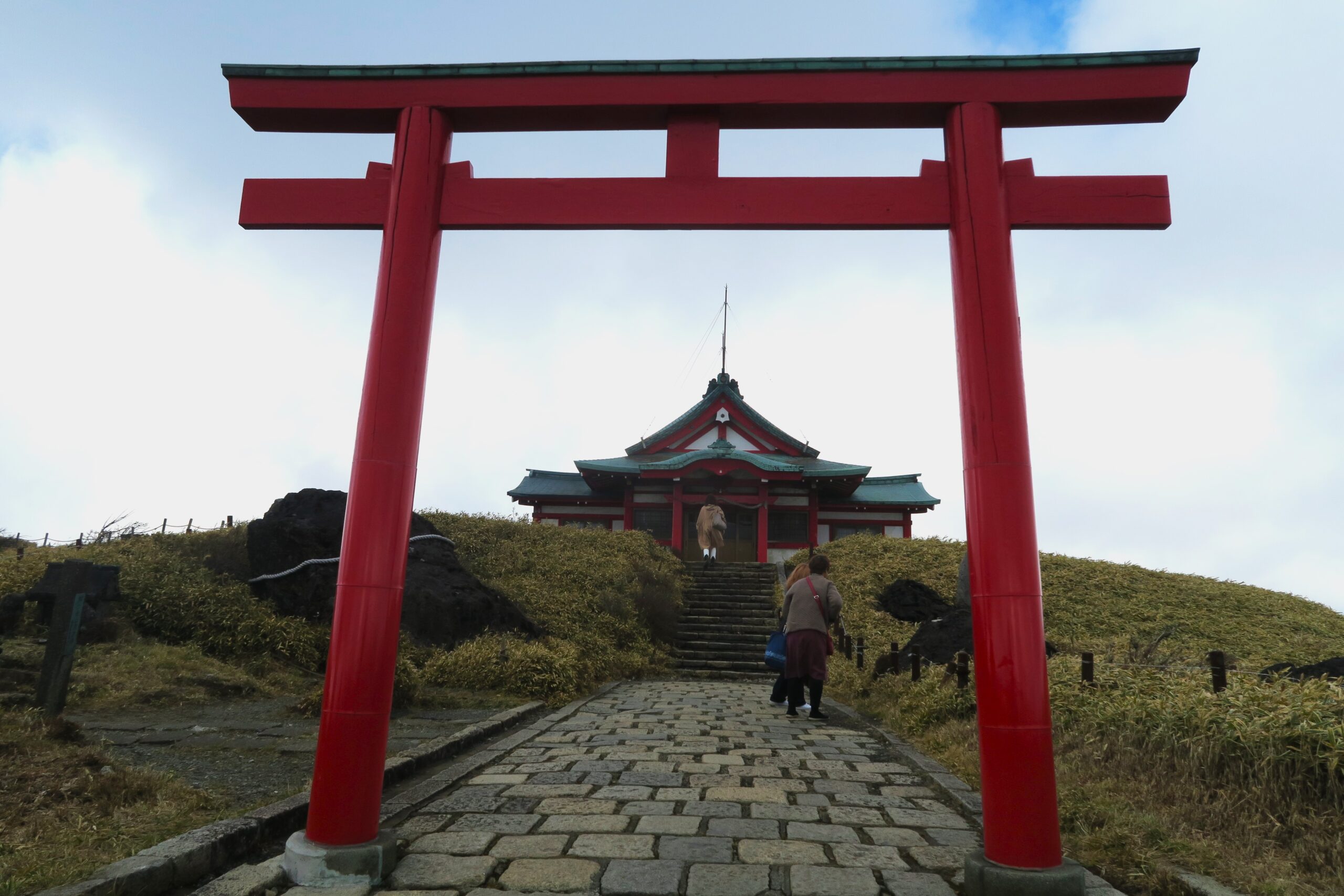 また参道右側には馬乗石があり、白馬信仰を今に残しています。現在の箱根元宮は昭和39年(1964)に再建されたもので、神山を拝む場所なので、本殿はなく、拝殿だけの社です。視界を遮るものの無い山頂に建つ赤い社は「天空の社殿」とも呼ばれ、印象的な風景です。天気が良ければ社殿の左手に富士山を望むことができます。