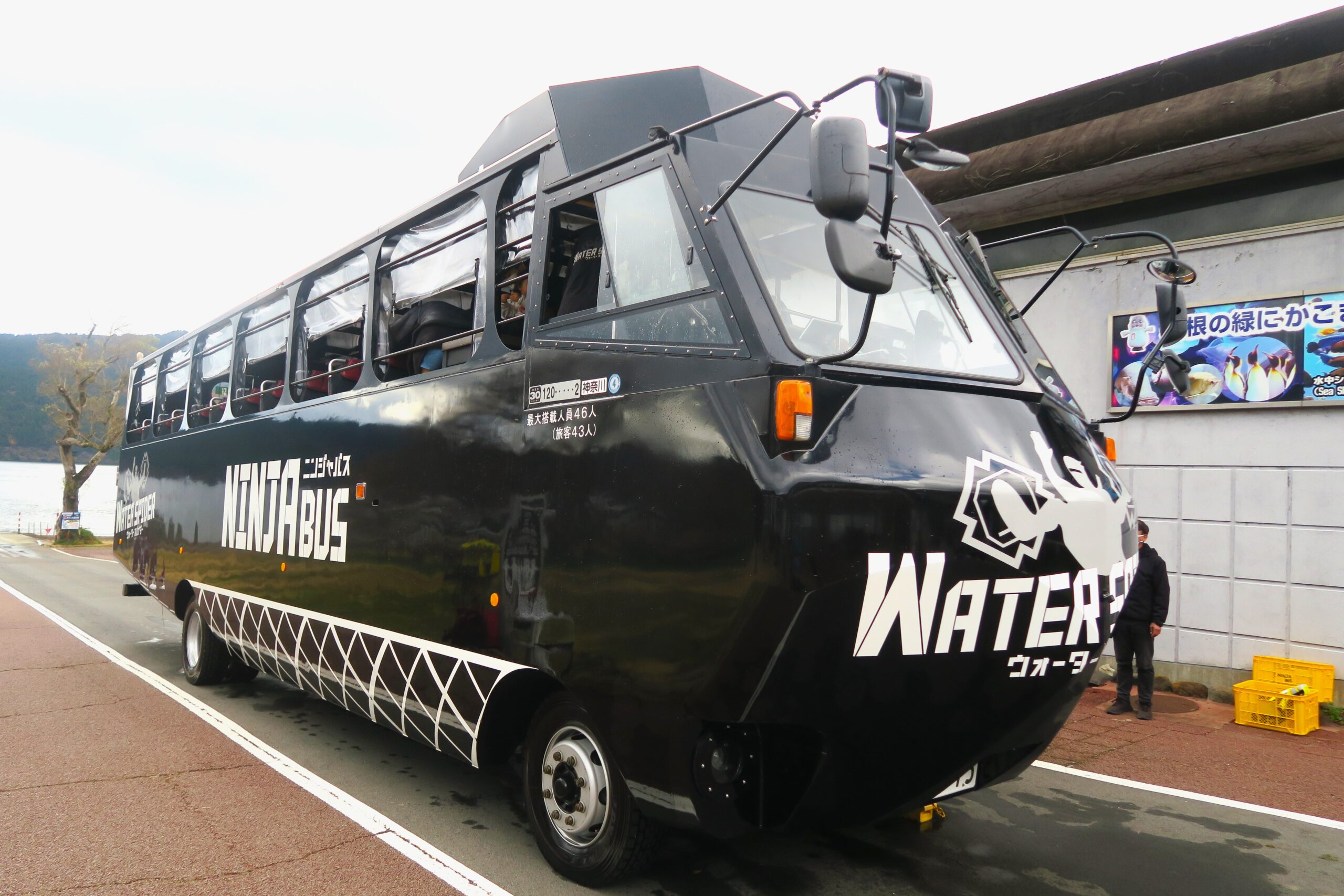 箱根園まで戻ってくると、「ニンジャウォータースパイダー」が停まっていました。忍者が水面を渡る忍術「水蜘蛛」をモチーフにした箱根初の水陸両用バスです。箱根園の桟橋から水しぶきを上げて芦ノ湖に飛び込んだ後は、のんびりと湖上遊覧が楽しめます。窓が開いているので水しぶきには注意です。