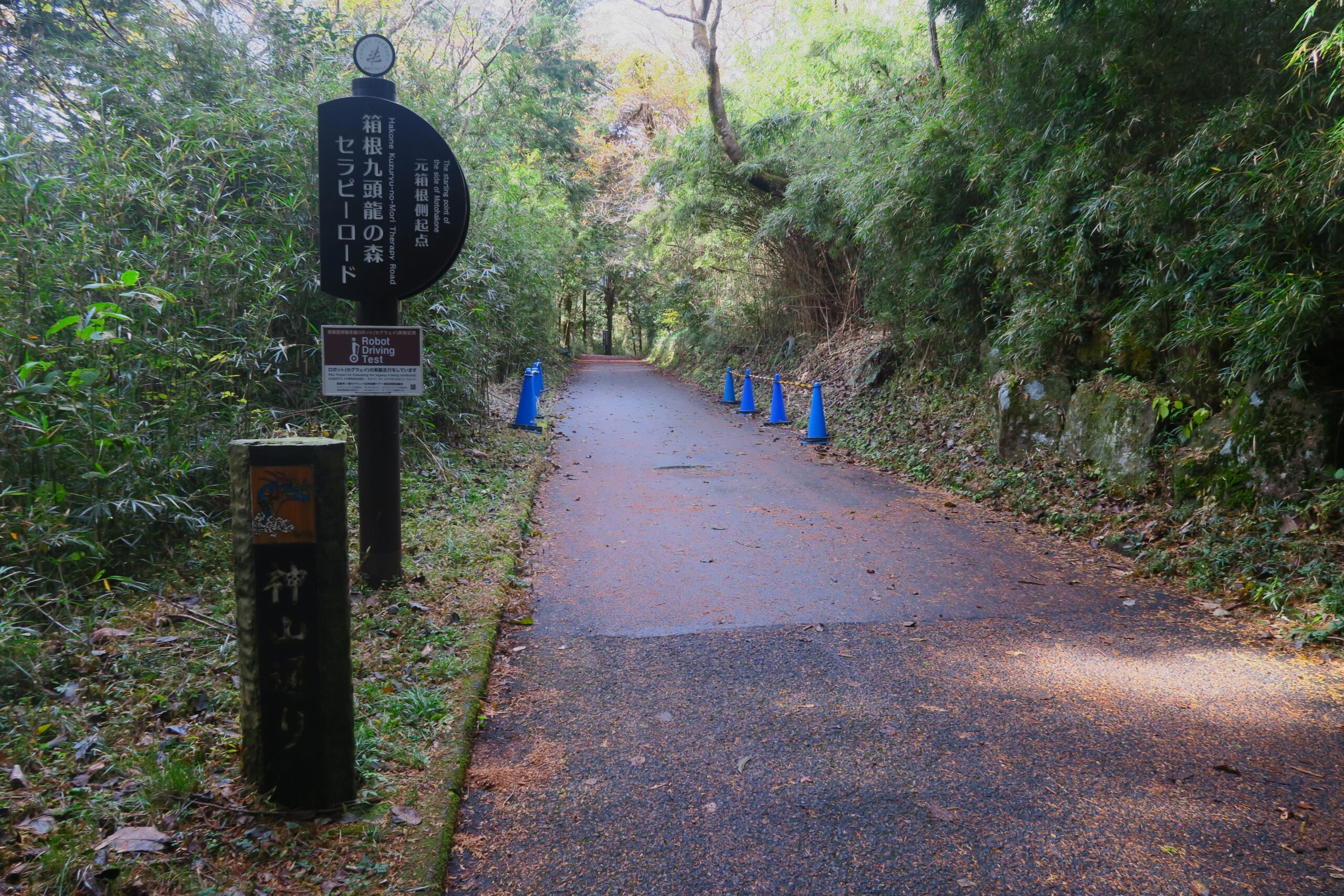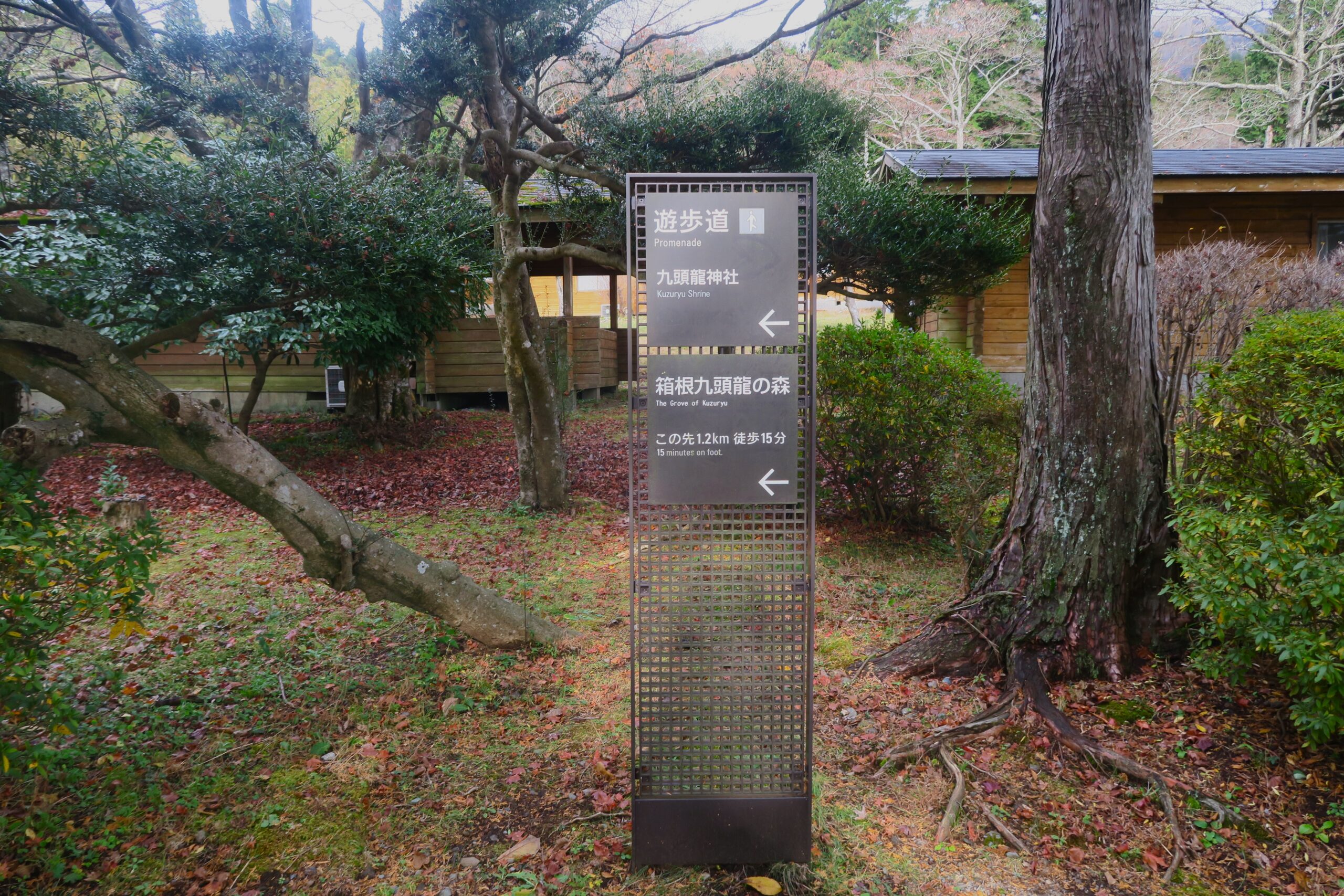 箱根園から「ザ・プリンス箱根芦ノ湖」の駐車場に向かって歩くと九頭龍神社への遊歩道の看板が立っているので標示にしたがって進みます。