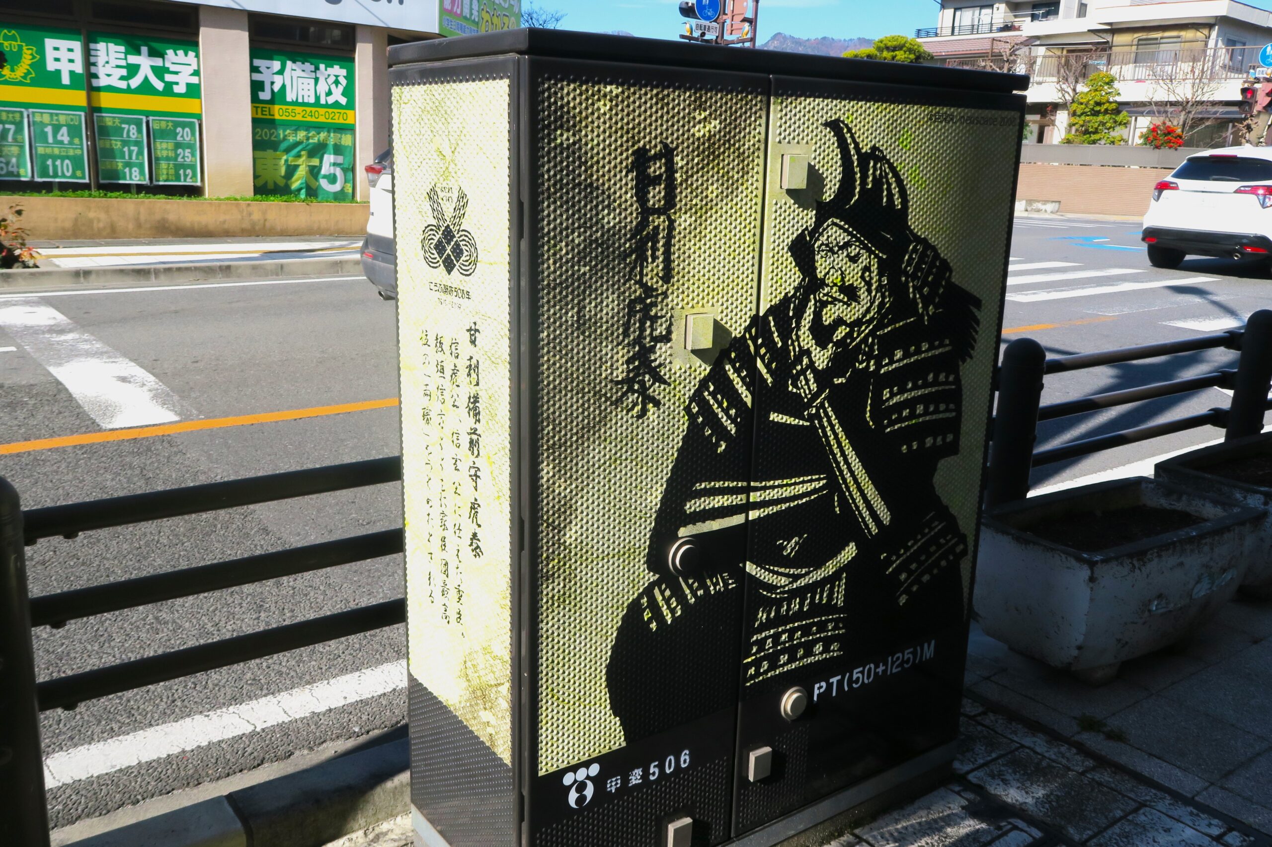 まずは武田氏館跡へ向かいます。武田家には、古くから有能な家臣が多く、信玄公の代になると武田二十四将としてその名をとどろかせました。甲府駅北口から館跡との間はかつて城下町だったエリア。中央の通りともいえる武田通り沿いの東電地上機器24器に「武田二十四将」の切り絵デザインでラッピングされています。甲府駅北口から緩やかな坂道をまっすぐに3km弱を山梨県出身の切り絵作家・百鬼丸さんの切り絵デザインを楽しみながら進みます。
