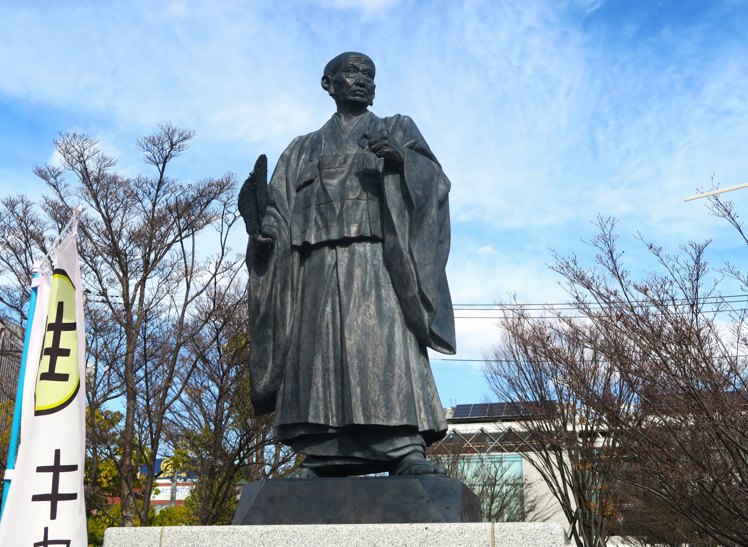 そして駅の北口には武田信玄の父・武田信虎の立像があります。信玄に比べてその名は知られていませんが、実は甲斐の統一に奔走し、躑躅が崎に城館を造営した「甲府の祖」です。彫像からはそのまなざしの鋭さを見て取れます。甲府開府500年を記念して2019年によっちゃれば広場に設置された銅像は、高さ2.1m、重さ400kgで右手に軍配を持ち、武田氏の本拠地躑躅ヶ崎館を背に、甲斐国を統一した後登ったと伝えられている富士山を見据えています。