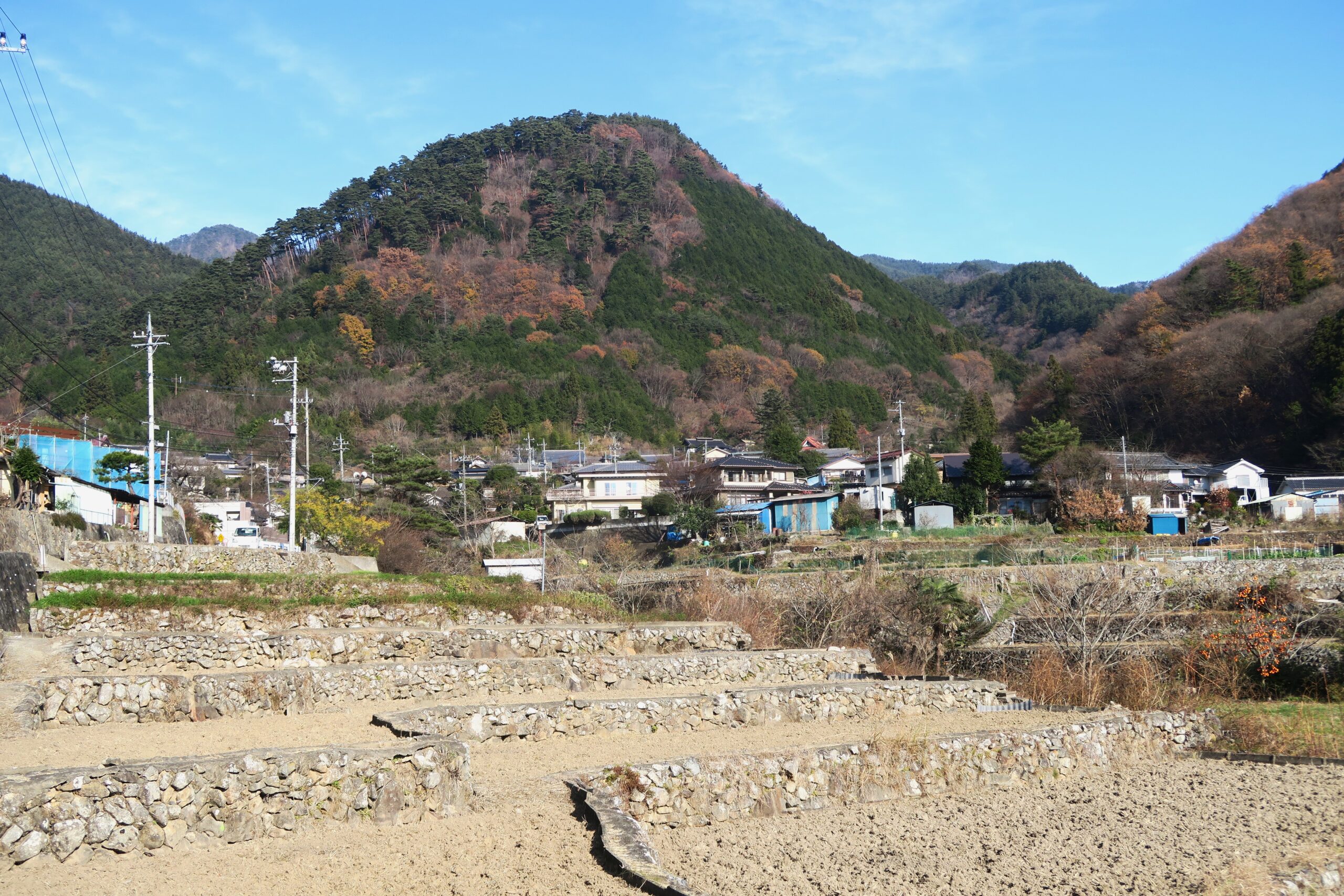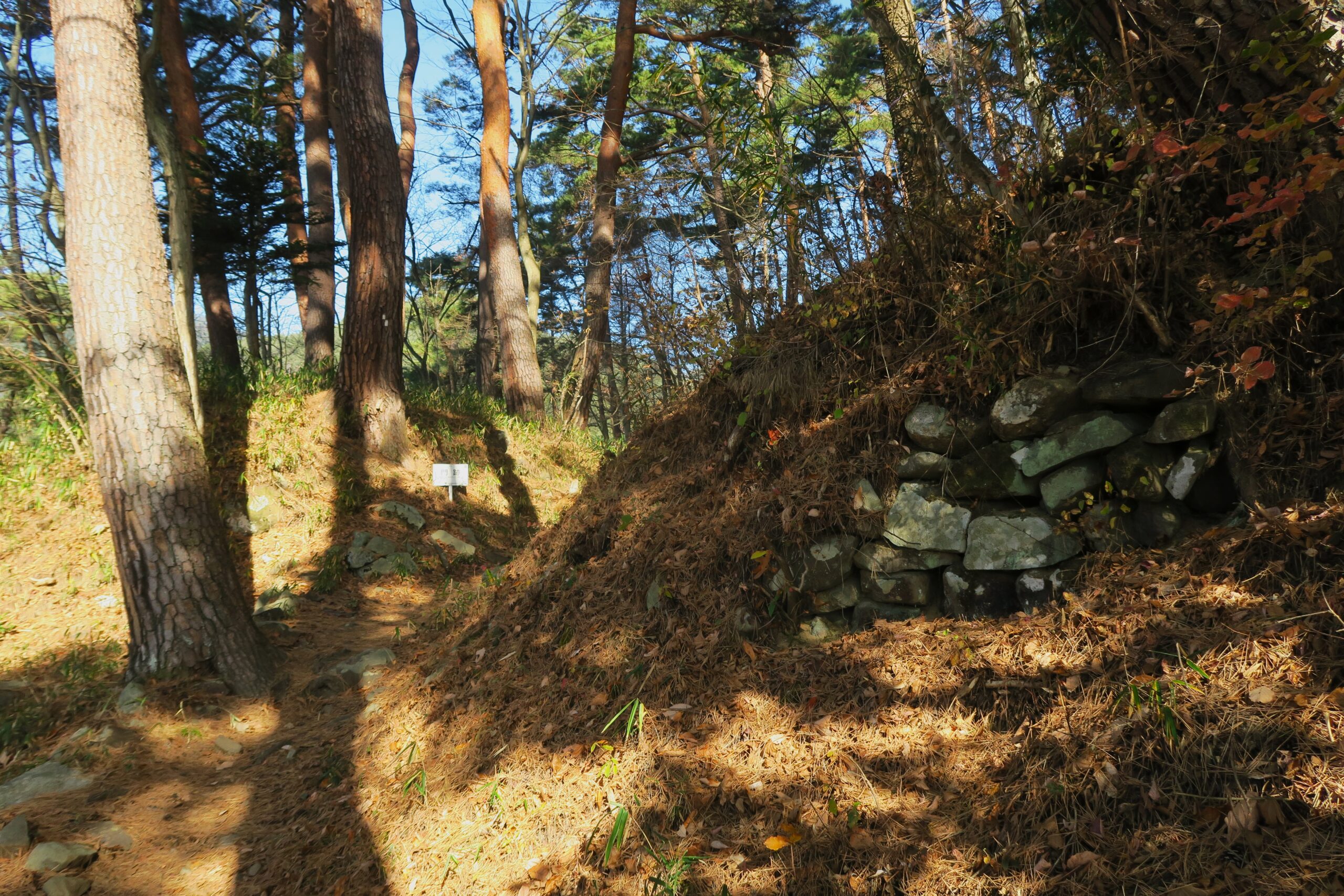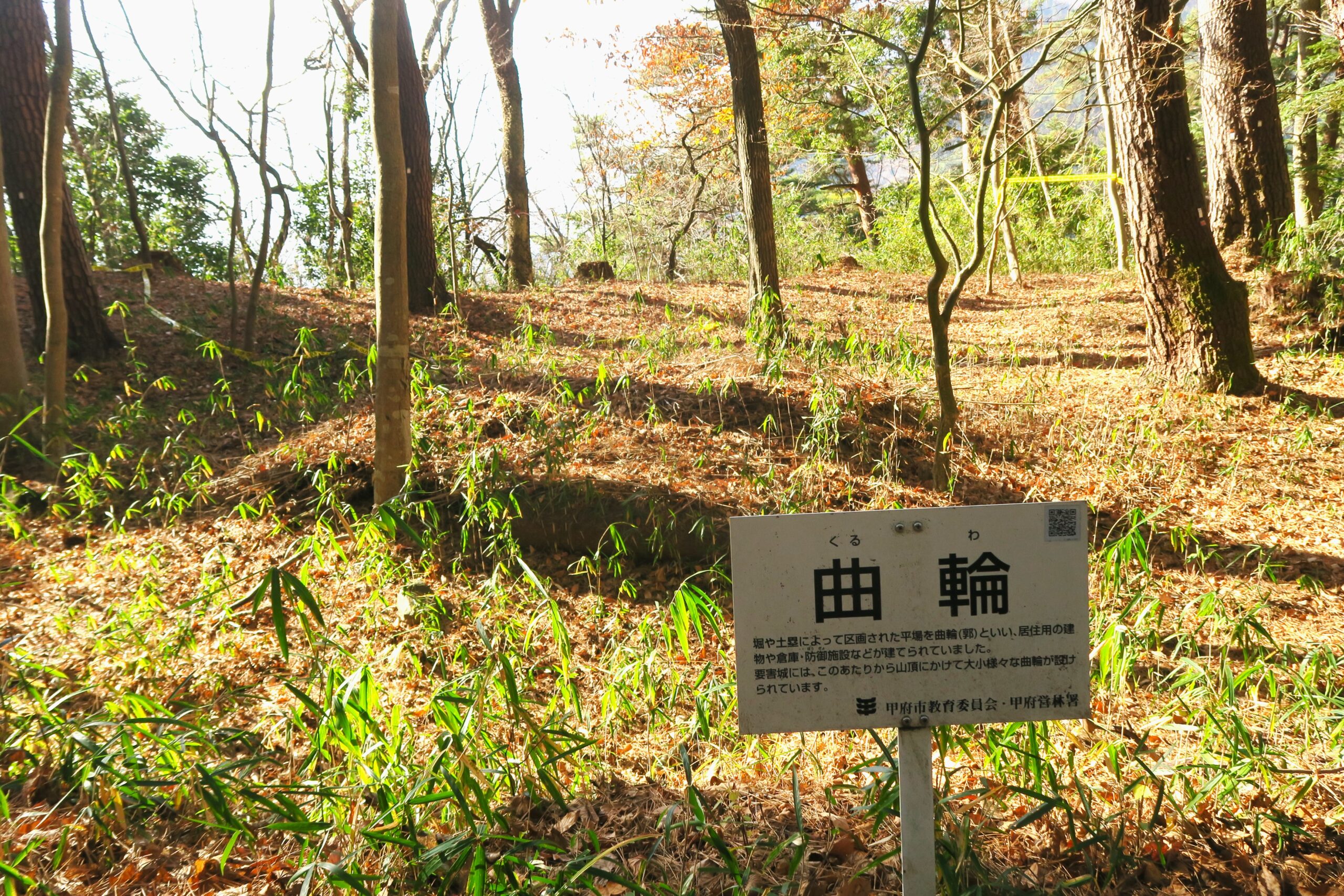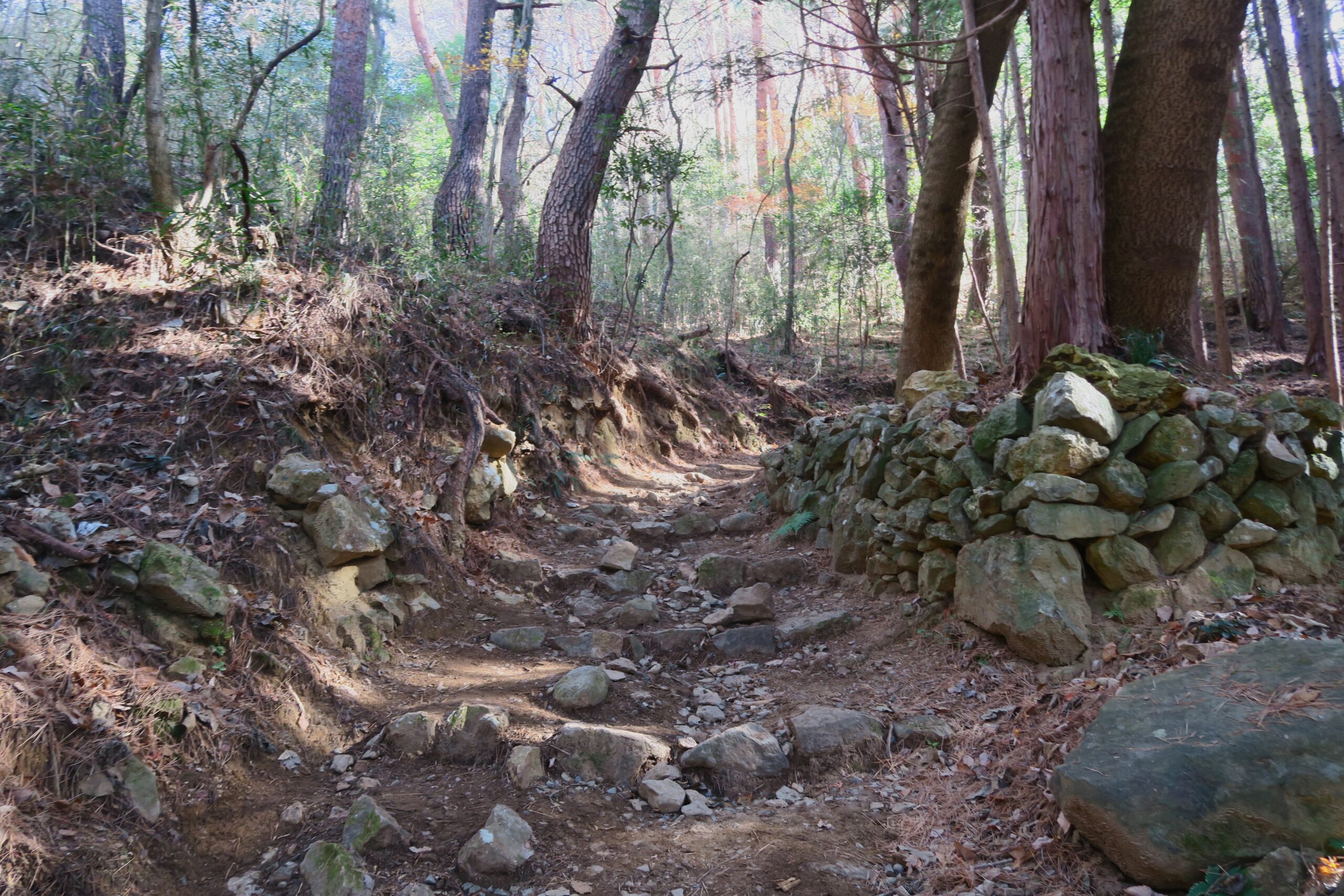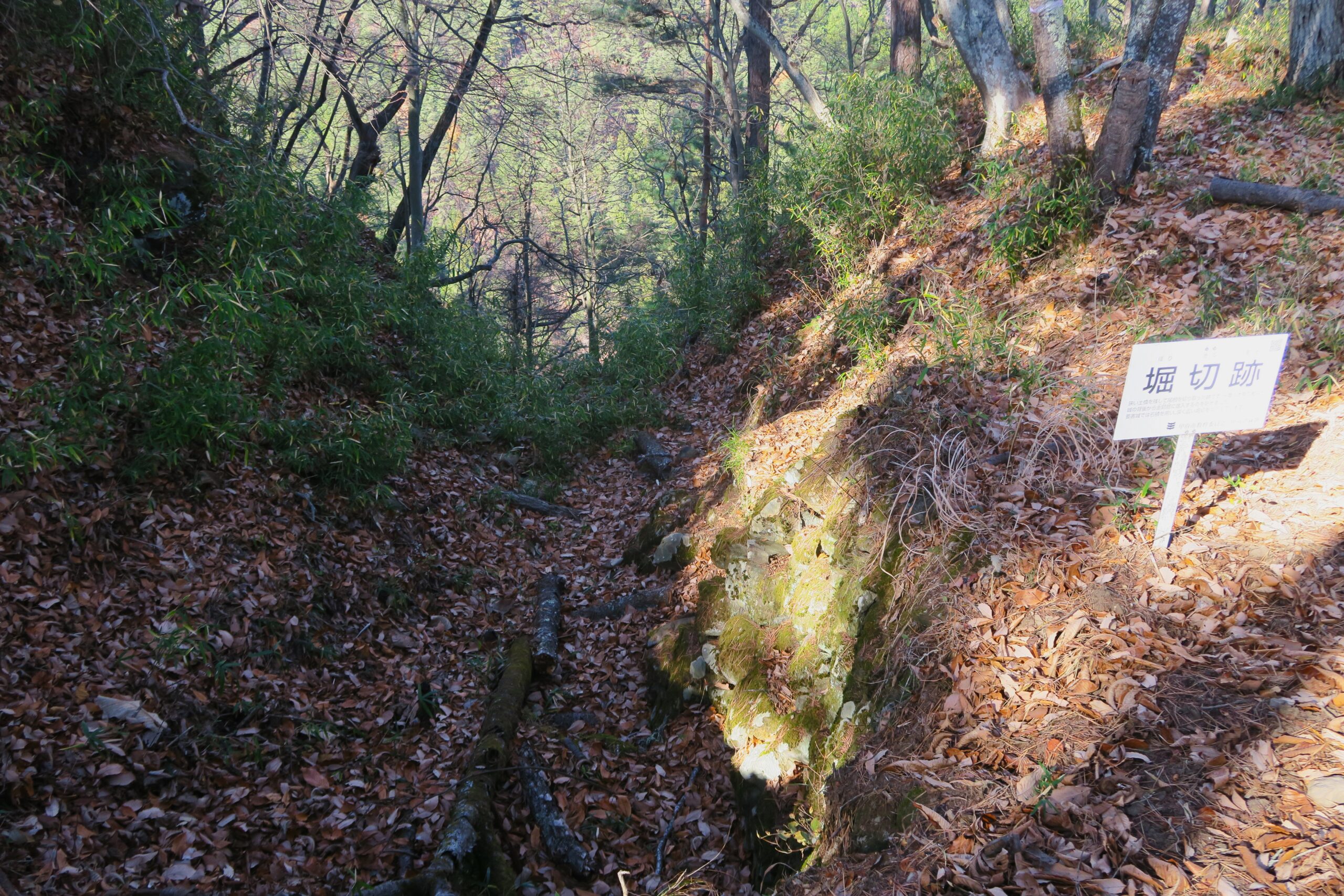 いよいよ山登りですが、登山道は整備されているので軽装備でも問題ありません。15分ほど登ると、土塁や竪堀の跡が見えてきます。城には山腹から主郭に至る通路に沿って、自然の地形を利用しつつ要所に竪堀や堀切の工事を施し、防御を固めている点が要害山城の特徴です。また枡形虎口に伴う門と曲輪が複雑かつ連続的に付設されています。