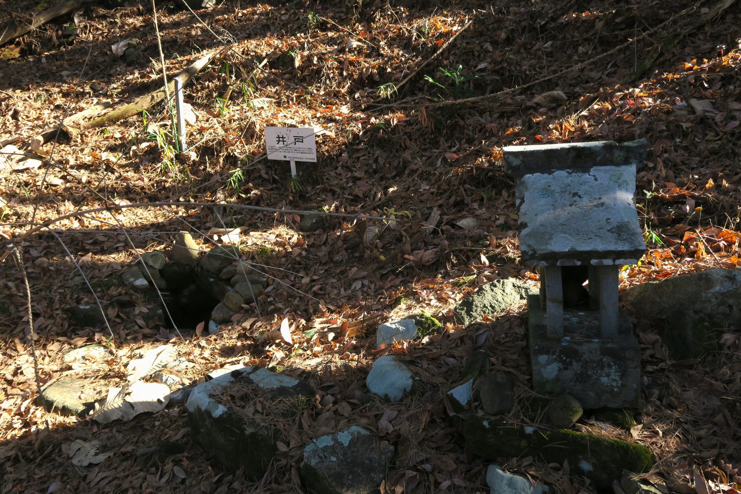 2、3m進み、左手に進むと井戸曲輪があり、水神様が祀られています。この井戸は、一年を通して水の絶えることがことがなく、築城の際、諏訪明神に祈って水を得たことから「諏訪の水」(井戸)名付けられたと伝えられています。傍らに祀られているのが諏訪明神の祠です。