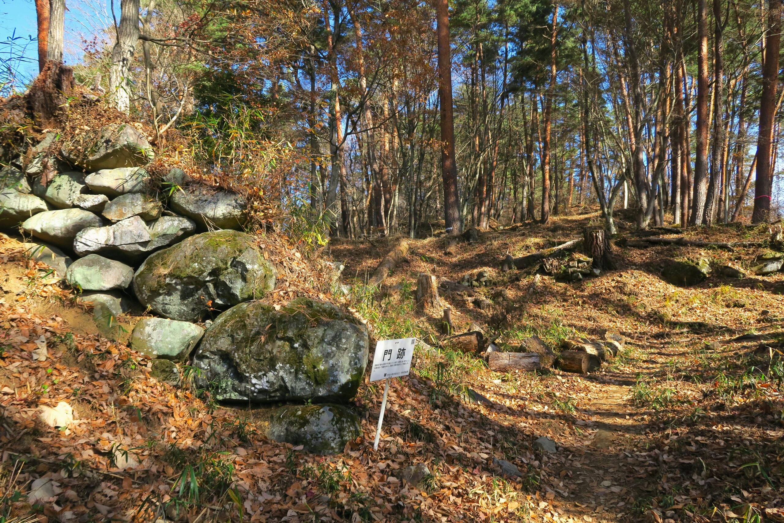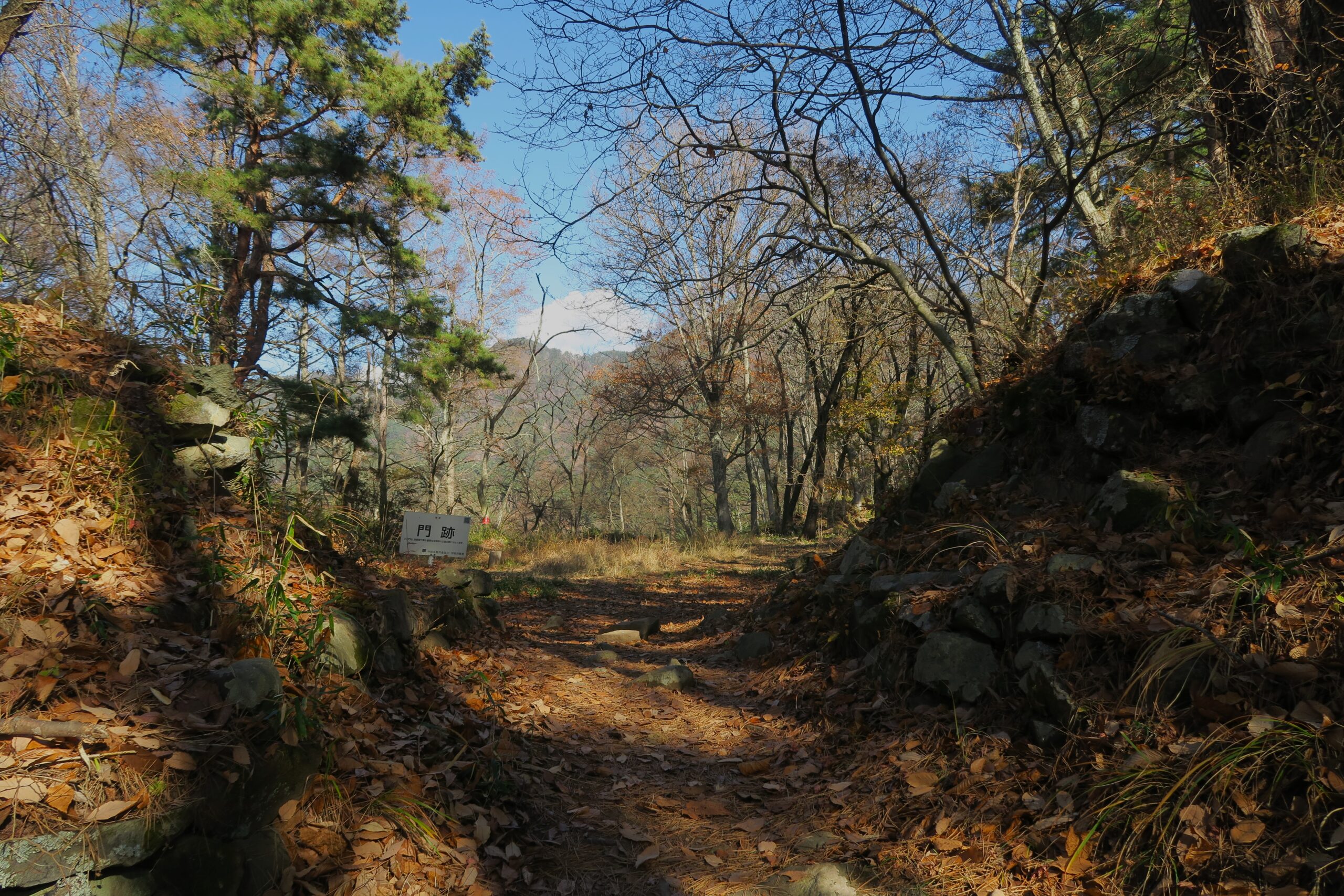 分岐に戻りさらに登ると要害山城で最も堅固な門の建っていた跡があります。両側に高く整然とした石積を築いて通路を狭くし、防御と攻撃の拠点として機能していました。