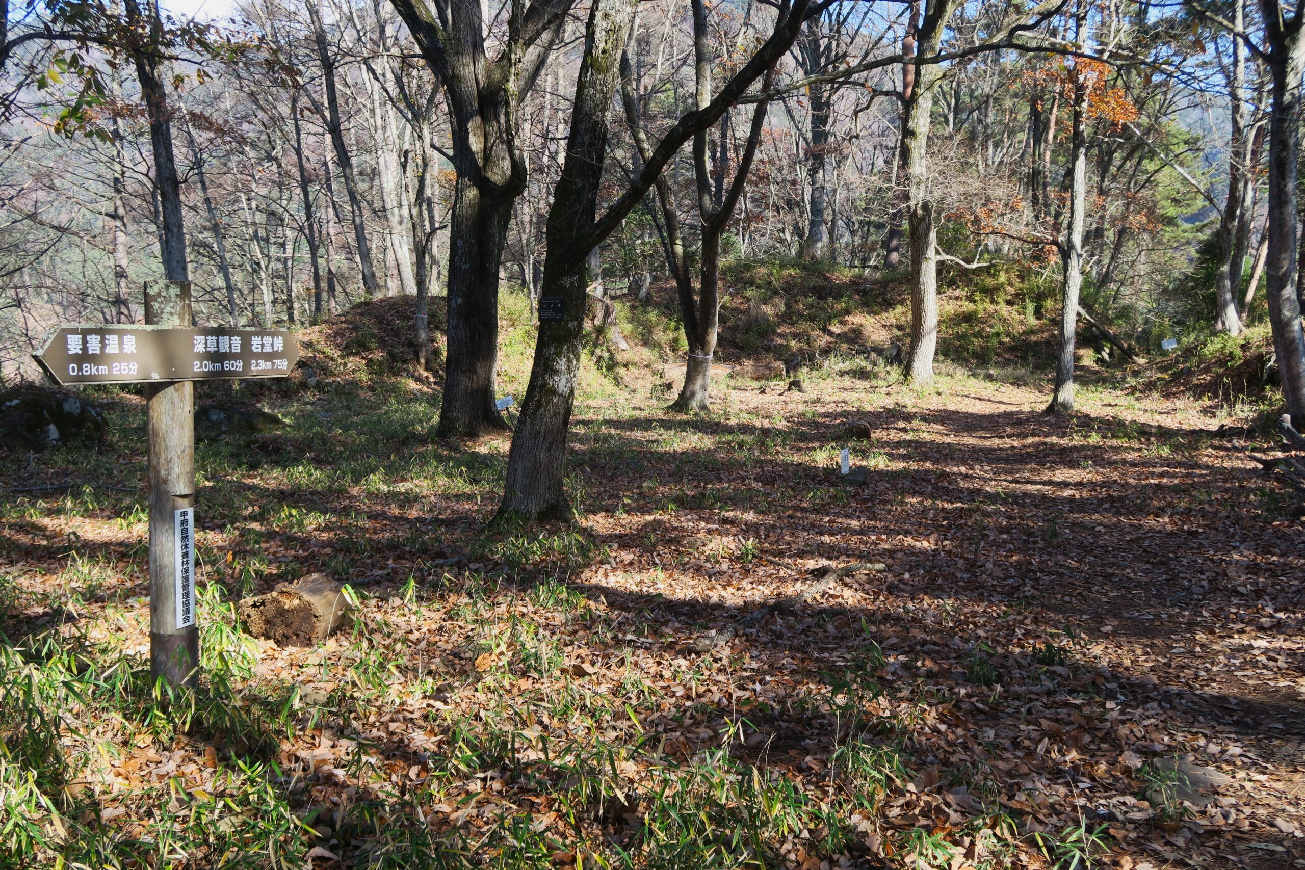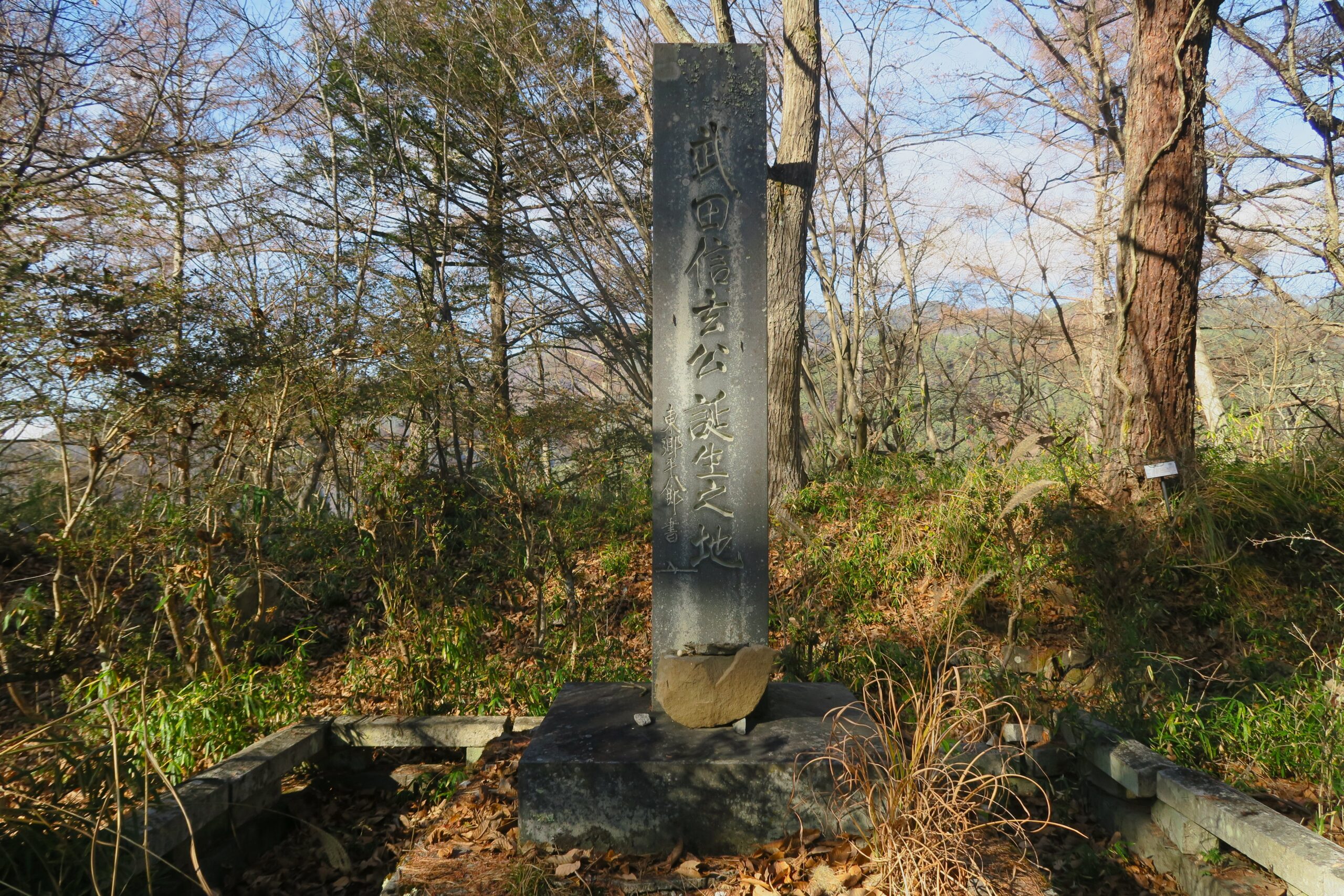 登山口から30分ほどで山頂の主郭に到着です。東西73m、南北22mの長方形で広く、山頂の周囲は土塁で固められていて、城主居館であろう比較的規模の大きな建物が建ち並んでいた広場と東郷平八郎の書による「武田信玄公誕生之地」の石碑があります。