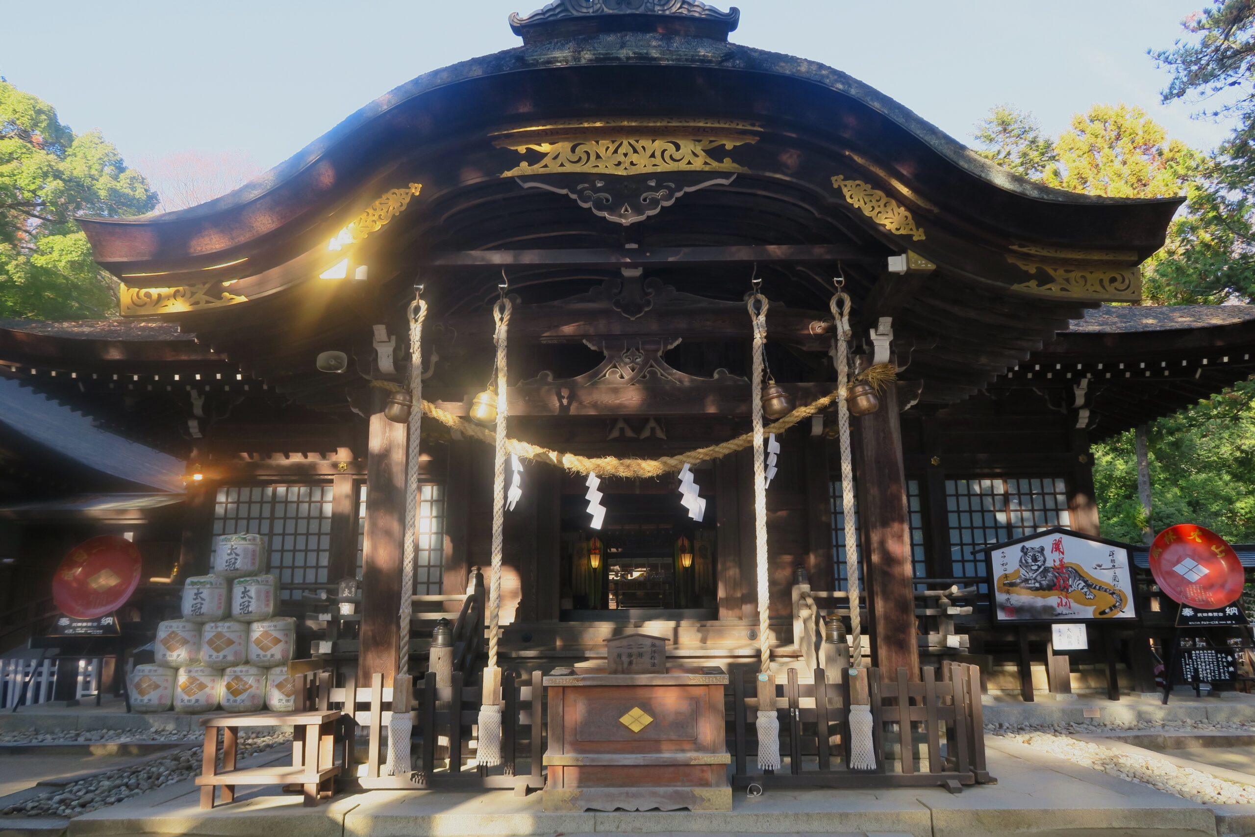 武田神社の創建は大正8年(1919)、武田信玄をお祀りしています。檜皮葺の拝殿、本殿は一間社流造りで質実剛健を感じさせる拝殿です。緑濃い境内には城館の当時から残る堀や土塁、近くには「信玄公御使用井戸」があります。なかでも拝殿に向かって左にある信玄が娘の産湯に使った「姫の井戸」は延命長寿、万病退散のご利益があると伝えられています。また黄金色になって落葉する奇木「三葉の松」などがみられます。